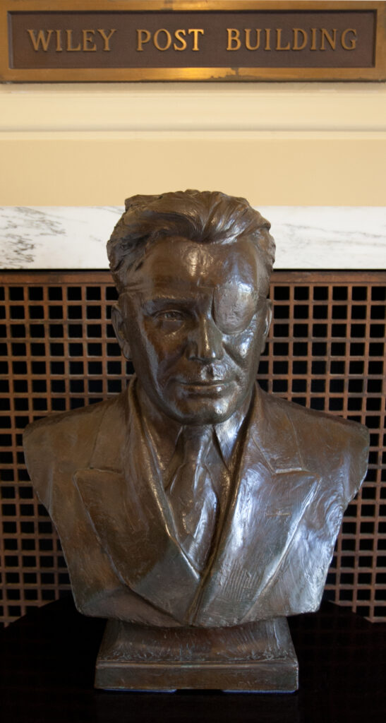 A bronze bust of late aviator Wiley Post welcomes visitors at the main entrance to the Oklahoma Judicial Center, home to Oklahoma’s Third Branch of Government.