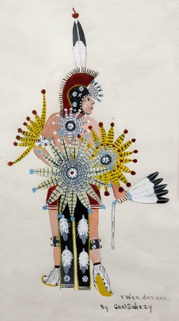 Only warriors who had earned the right could wear feathered headdresses. Carl Sweezy described these as “rows of eagle feathers tipped at the end with a little tassel of dyed horsehair, it was a fine piece of handiwork.”