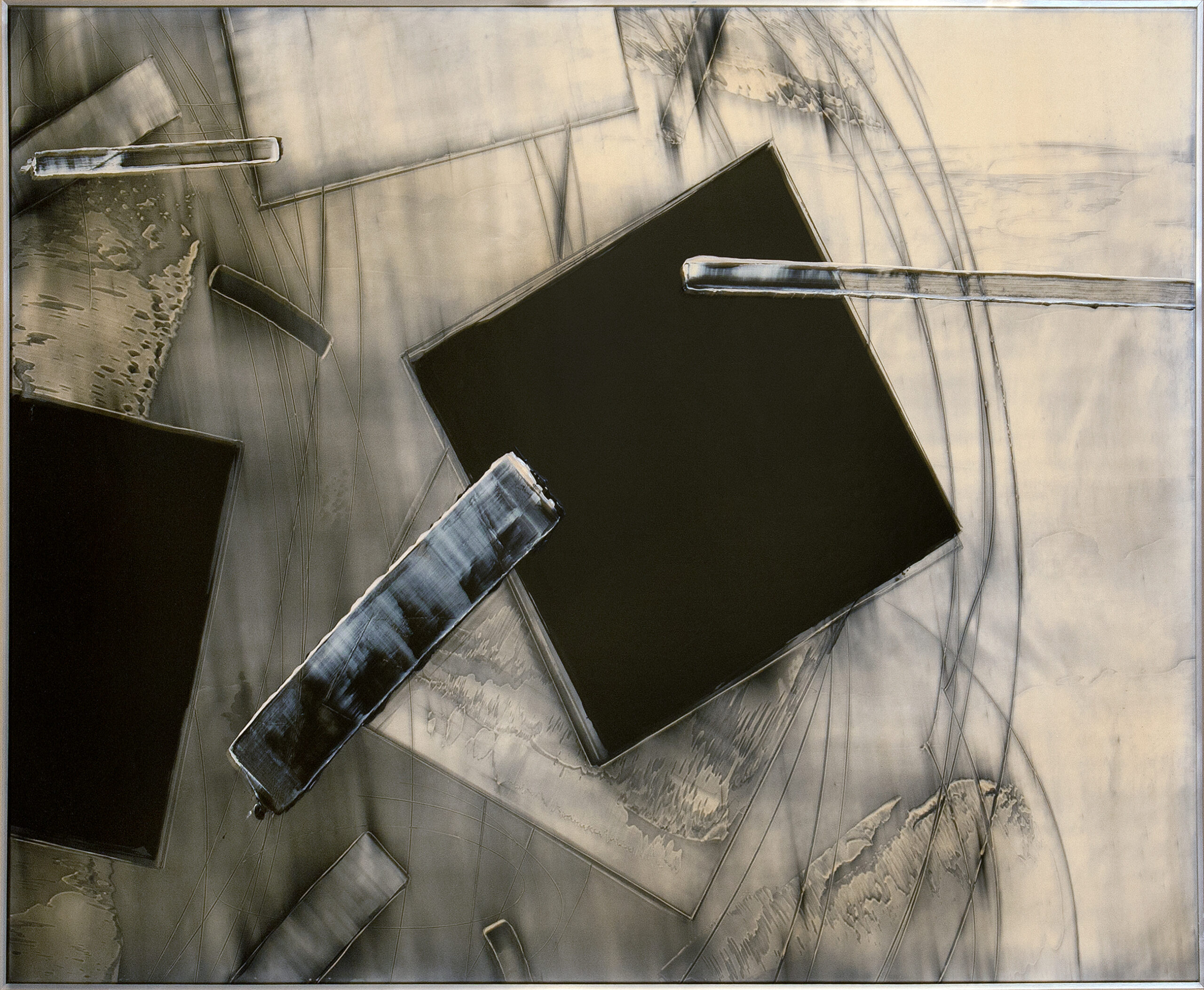 Eugene Bavinger created Arc Series #5 by applying as many as 15 to 20 layers of acrylic paint and gel to a glass surface, then transferring the finished composition to canvas. It was purchased for the Oklahoma Judicial Center collection in 2011.