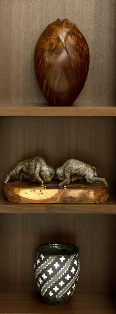 b. July 16, 1995, Tulsa, Oklahoma Coleman Lisan Tiger Blair has been sculpting nearly all of his life. His mother, artist Dana Tiger, see page 89, was once very surprised when her toddler son handed her a perfectly formed rose. “The petals were so delicately formed, it was just amazing.” At this point, Lisan couldn’t even talk yet. Since then, Blair has continued perfecting his art with great success. He’s brought home first place awards from the Red Earth Festival, the Tulsa Indian Arts Festival and the Santa Fe Indian Art Market. In July 2013, he taught sculpture workshops as part of the Living Earth Festival at the National Museum of the American Indian. Blair is now a senior at Sequoyah High School in Tahlequah, making him the youngest artist included in the Oklahoma Judicial Center Collection. He is a member of the Muscogee (Creek) Nation and of Creek/Seminole and Cherokee descent. Rivals was purchased for the Oklahoma Judicial Center Collection.