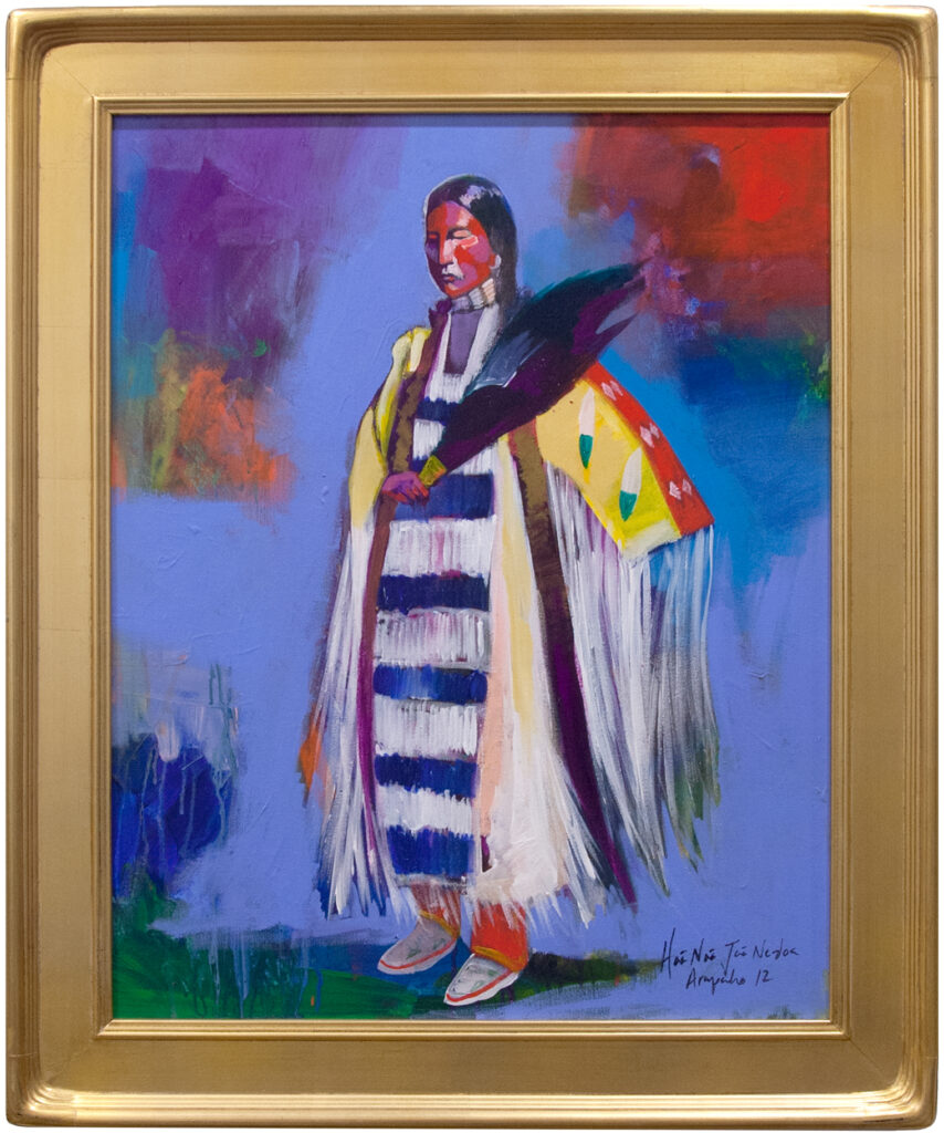 Learned’s bold vision of Buffalo at Dawn is a contemporary interpretation of an ancient symbol. “To the Native Americans, the buffalo means life,” he said. The buffalo provided food, fuel and lodging for the Cheyenne, Arapaho and other Plains tribes. Learned’s choices with this painting give it a distinctive look that is truly his own. “I like to use colors that you might not normally associate together.” Learned painted Fire and Ice after attending a Sovereignty Symposium reception honoring presenters, tribal leaders and artists at the Oklahoma Judicial Center in 2012. He said the Buffalo looked lonely in the conference room and needed company. He generously donated a major portion of the cost of the paintings to cure the Buffalo’s loneliness.