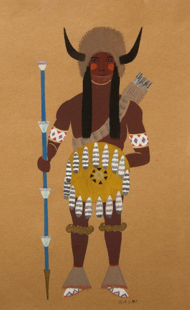Asah’s line drawings and paintings were meticulous in their replication of feathers and beadwork depicted in regalia. The buffalo was considered earth’s greatest gift to the Kiowa, providing food, shelter, clothing and weapons. Wearing the animal’s horns, as illustrated in Buffalo Priest, was an honor reserved for the respected medicine men of the tribe.
