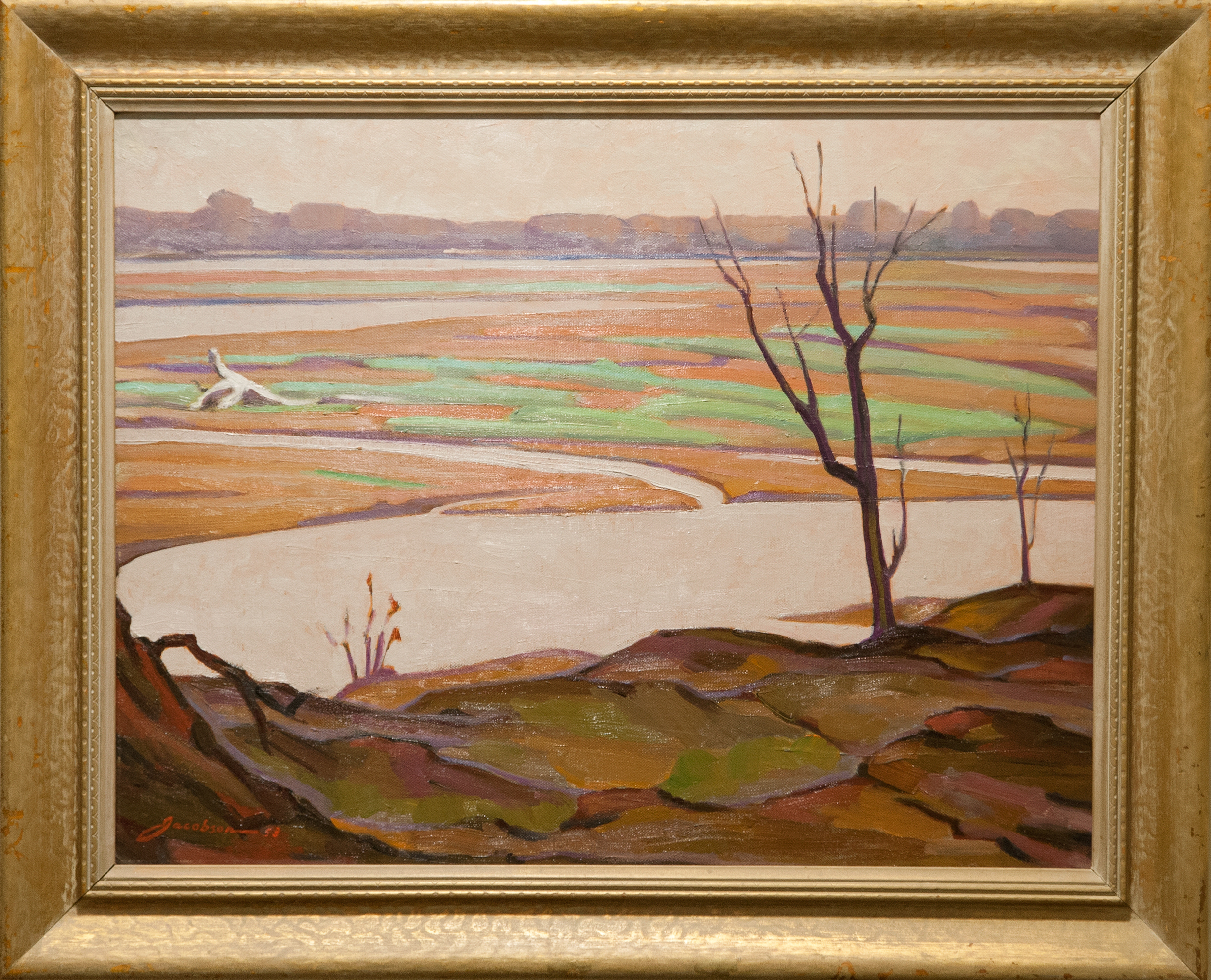Oscar Jacobson painted this landscape in 1953, the year before he stepped down as director of the University of Oklahoma’s School of Art. Later in the 1950s, Jacobson was involved in a unique effort to bring art into people’s homes. For a time, the Oklahoma Art Center included a “lending gallery” that allowed customers to rent paintings for a few months, then either return or purchase them. Rental prices started at $1 per month, on a 1/50 scale based on the purchase price, i.e. a $50 painting would rent for $1, a $100 painting for $2 and so on. After three months, the renter was obligated to return or purchase the painting. If the customer decided they wanted to buy, their rental payments applied to the purchase price. The lending gallery was established by Nan Sheets, see page 129. Articles about the lending gallery tout the “Oklahoma scapes” of Jacobson among the popular paintings rented from the gallery.
