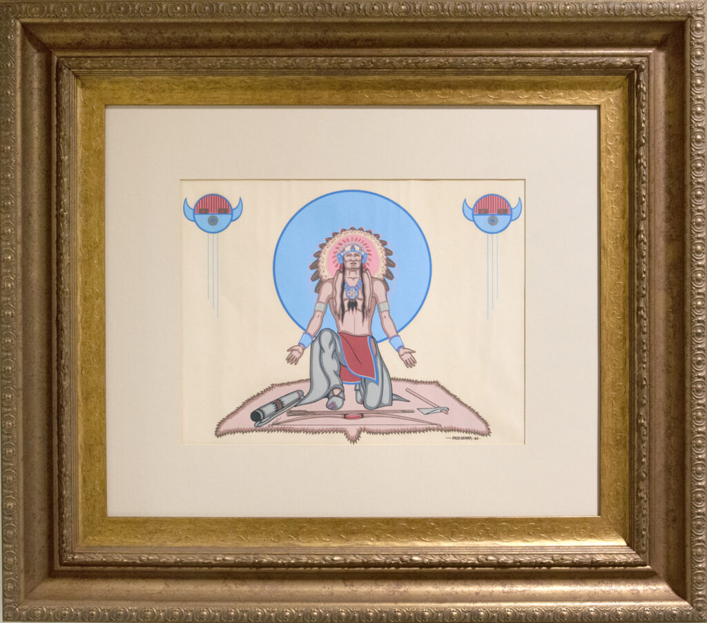 Fred Beaver didn’t set out to be an artist. When he attended Bacone College in Muskogee, he took business courses. Then came World War II and he served in the U.S. Army Air Corps, stationed in Italy. Amongst the works of European masters, art crept into his life. Letters home to his wife, Juanita, were often decorated with sketches. She encouraged him to pursue his interest in art and he took a few private lessons.