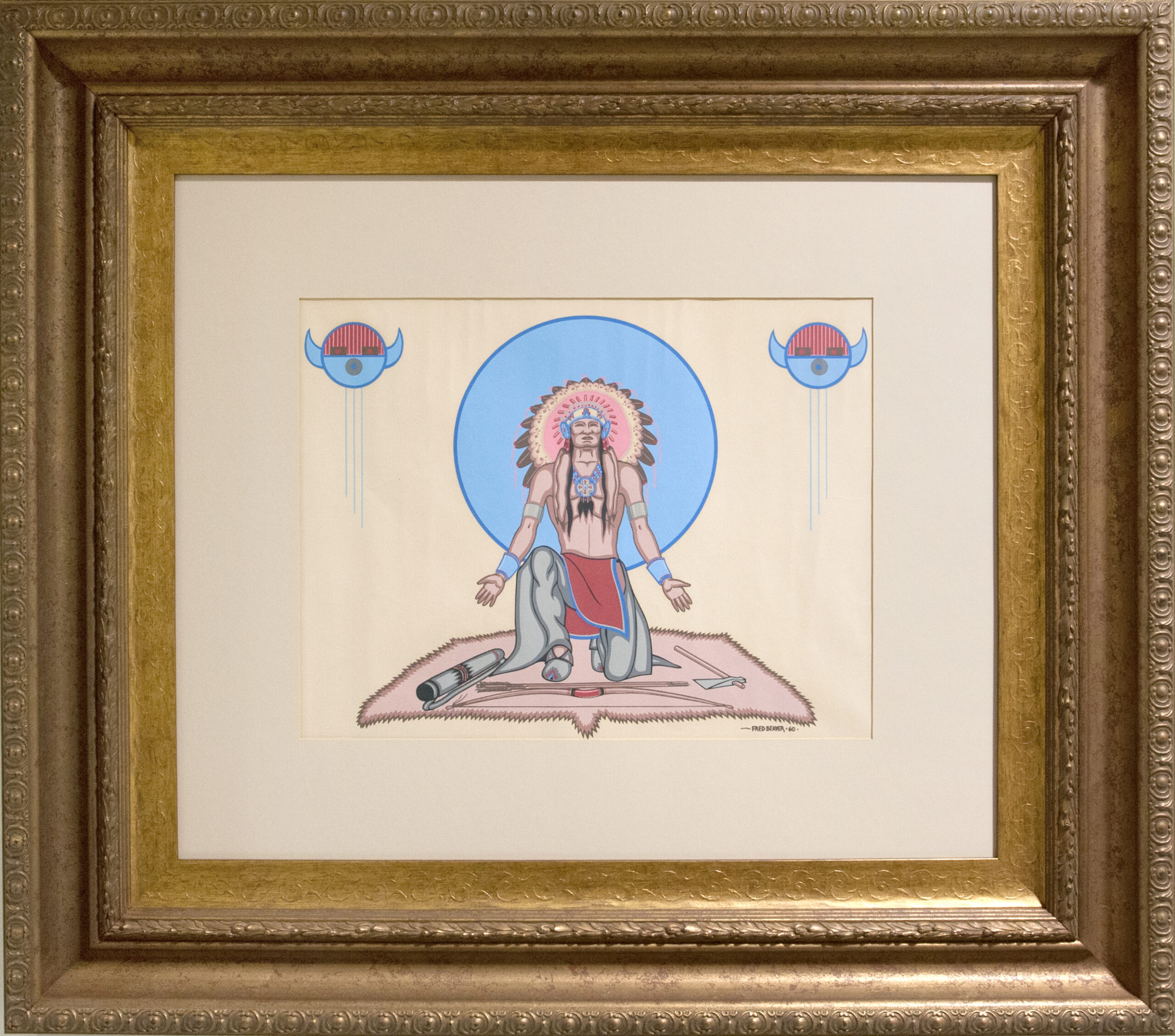 His work earned honors in competitions at the Denver Art Museum, the Heard Museum in Phoenix, and the Philbrook Museum in Tulsa. He also completed a number of notable commissions, including one from the Republican Committee for a painting that was presented to President Eisenhower. The Franklin Mint commissioned him to design medallions for the 1976 United States Bicentennial celebration. His work is included in collections across the country, including the University of Nebraska, the Museum of Northern Arizona, and the National Park Service Collection. This piece was purchased for the Oklahoma Judicial Center Collection.