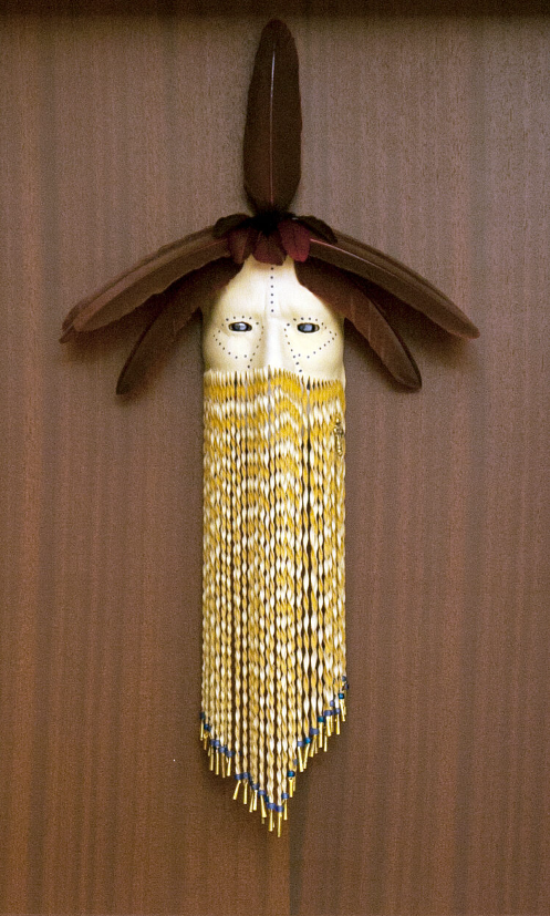 Corley’s masks are all unique, one-of-a-kind originals. He keeps track of the designs on his computer and is careful not to duplicate a combination of feathers, beads, leather or paint. His work has been recognized with awards at many competitions. Recently, one of his masks, Reflection, won the grand prize at the 2012 Trail of Tears Art Show. His work has received numerous other recognitions and is prized by collectors around the world. Immortals was purchased for the Oklahoma Judicial Center Collection.