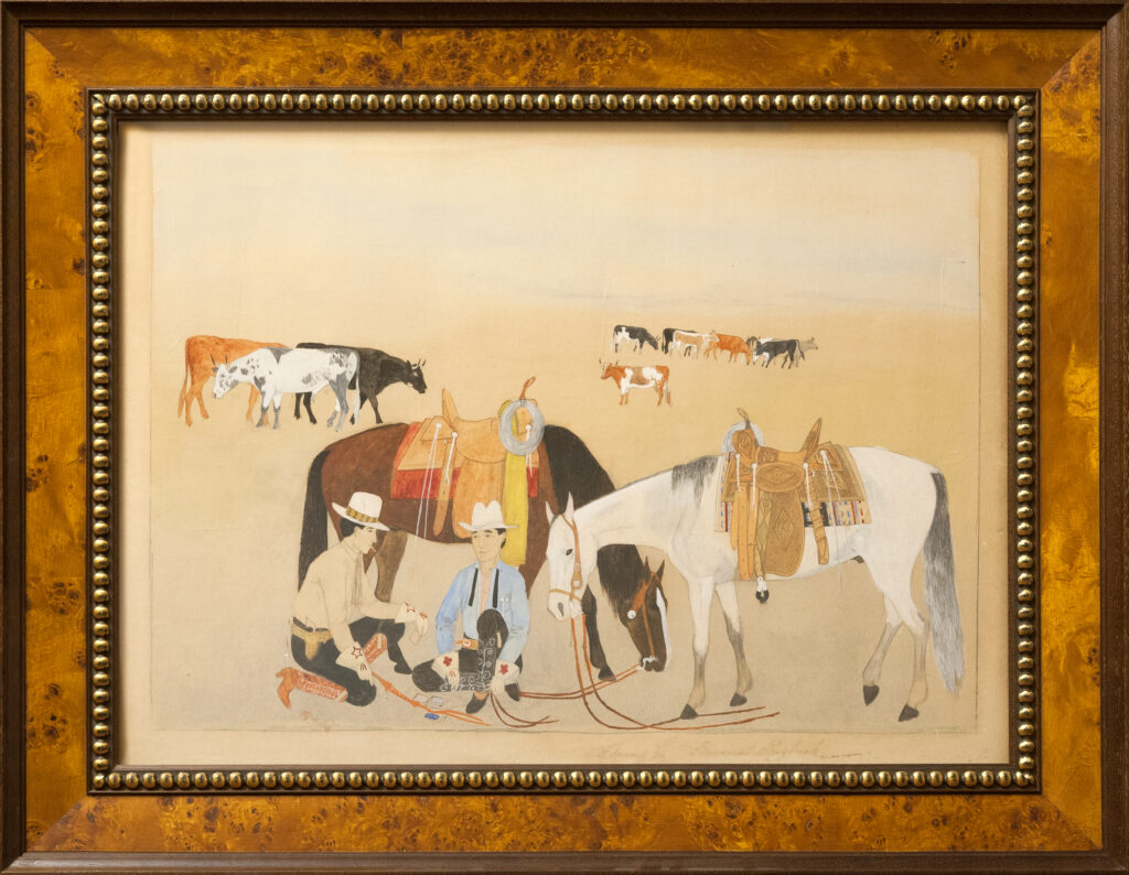 As such, nearly all the paintings acquired by Harrington for the American Indian Museum depict Native ceremonies and gatherings. However, Harrington noted that Spybuck’s favorite subjects were cowboys, cattle and range scenes, as shown in the piece displayed at the Oklahoma Judicial Center. Note the intricate leatherwork on the saddle and the embroidery of the cowboys’ gloves.