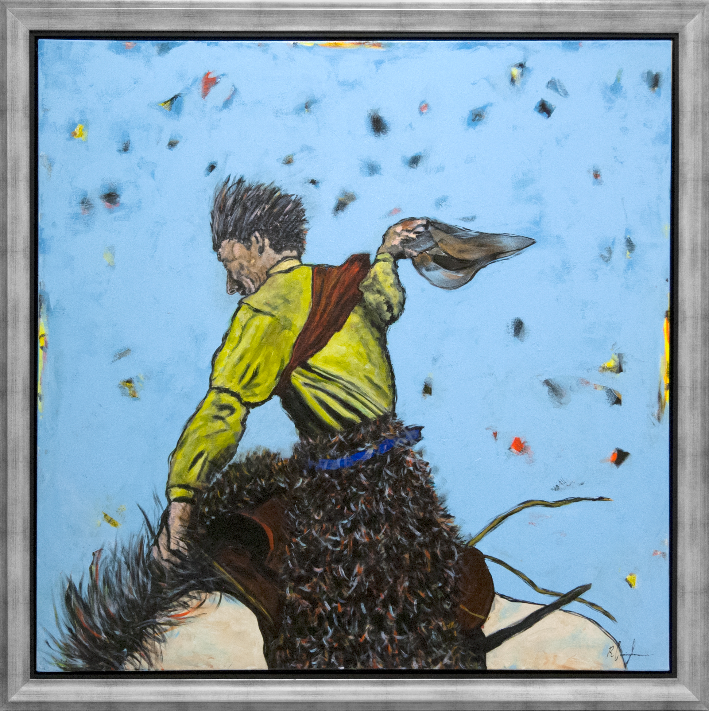 Artist Ryan Cunningham has always loved rodeos and attended the National Finals during his youth. The painting depicts a saddle bronc rider struggling to stay atop a bucking horse. The competitive rodeo event owes its existence to the horse breaking skills required of working cowboys. Today’s competition horses are specially bred by producers like the Beutlers for their strength, agility, and bucking ability. During the competition, riders attempt to stay in the saddle for eight seconds without their free hand touching the horse.