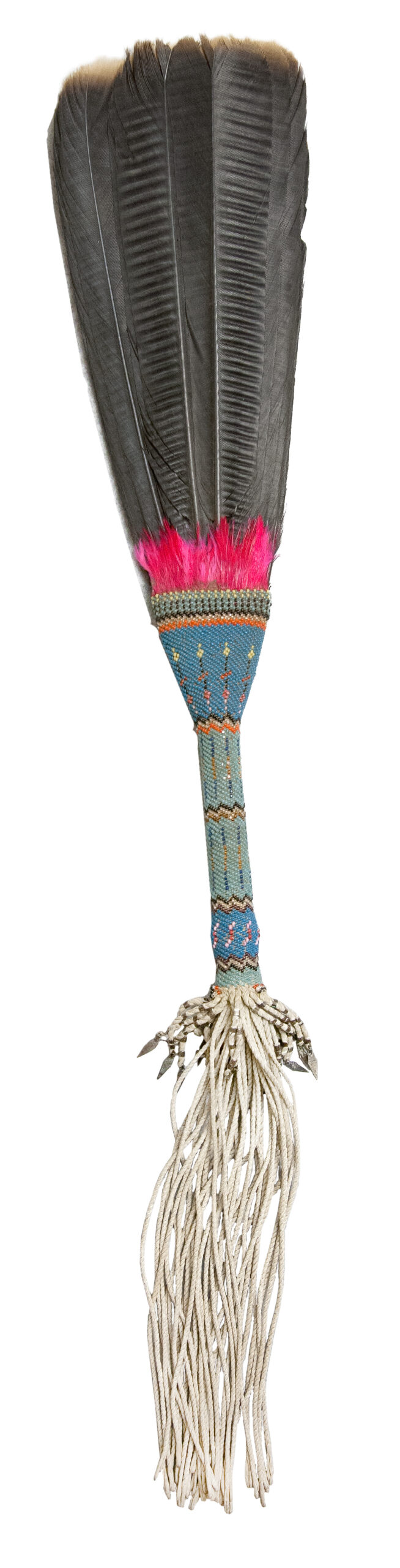 ( 2 ) The larger beads of this fan indicate it was probably reworked in the 1970s. Mature golden eagle feathers from an older fan were likely retasked to create a new fan. The beadwork design is pan-tribal rather than using specific motifs from a particular tribe.