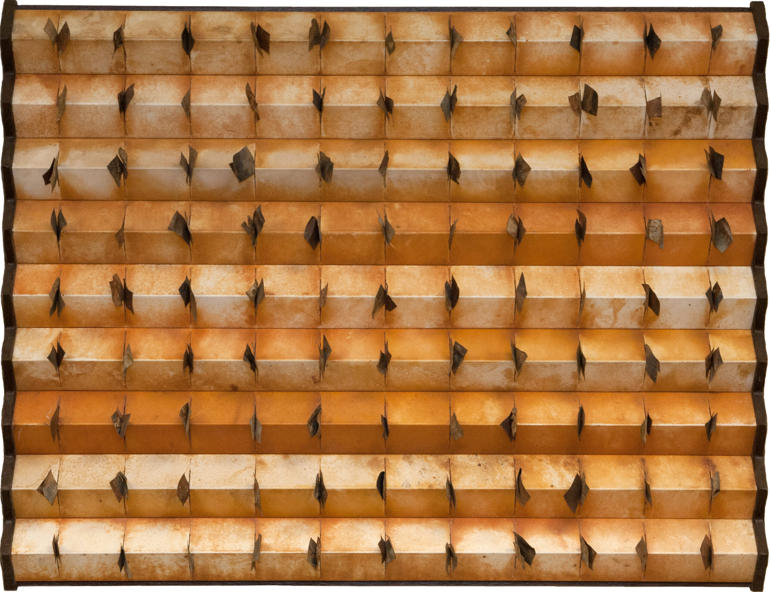 Fate, Chance or Circumstance was first displayed in the Governor’s Gallery at the State Capitol before being purchased for the Oklahoma Judicial Center collection. The sculpture is composed of steel along with both wenge wood and padauk wood. The small metal rectangles evoke images of the briefs filed in each case that comes before the Supreme Court, making the Clerk’s office a natural choice for displaying this piece.