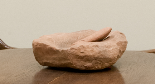 Displayed with the Peyote Ceremonial Tepee is a grindstone found by Jack McLemore on his farm near what is now Colony, Oklahoma. In designating the site as a National Historic Landmark, archeologists describe the area as having been a small village of the Plains agricultural complex, dating back to A.D. 1000. This area was included in the Cheyenne-Arapaho Reservation. The grindstone sits on a table that belonged to Justice Yvonne Kauger’s great-grandfather, Fred Kauger, a German from Russia, who settled in Colony before statehood.