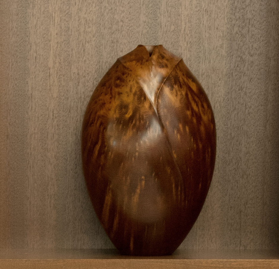 Burls are a favorite material for Cheyenne artist Nathan Hart. These areas of knotty growth are characterized by interlocking grain patterns or colors. Trees produce burls in response to stress: an injury, virus, fungus or insect attack. Beauty is often born of hardship. When a burl is cut and polished, unique abstract patterns and designs not normally found in the wood are revealed. Burl wood can sometimes be difficult to work with because the grain is twisted and interlocked, lending itself to unpredictable chipping. Interlocking grains also produce extreme density, making them resistant to splitting. This quality has long made burls a top choice for bowls and wooden tools. Hart is a self-taught wood artist, who bought his first lathe in 1983, shortly after graduating from Bethel College in North Newton, Kansas. In 1989, while riding a horse, Hart planted a ceremonial spear to designate the site for the Meeting Place and Indian Nations Flag Plaza in the State Capitol complex. His father, Chief Lawrence Hart, one of the principal chiefs of the Cheyenne tribe, conducted a traditional Cheyenne blessing of the site. After a successful career in finance and investment, Hart turned to art full time in 2001. Hart’s wife, Melanie Stuckey, has long been a judicial assistant for the Oklahoma Court of Criminal Appeals. Hart’s pieces have earned several awards, including first place at the Santa Fe Indian Market and Best of Division at the Heard Museum Guild and Indian Fair and Market. His work was highlighted in a 2006 exhibit at the Museum of Arts and Design in New York and featured in an exhibit organized by the American Indian Cultural Center. He was also included in the Inaugural Exhibition of the Oklahoma State Art Collection at the State Capitol to celebrate the Centennial in 2007.