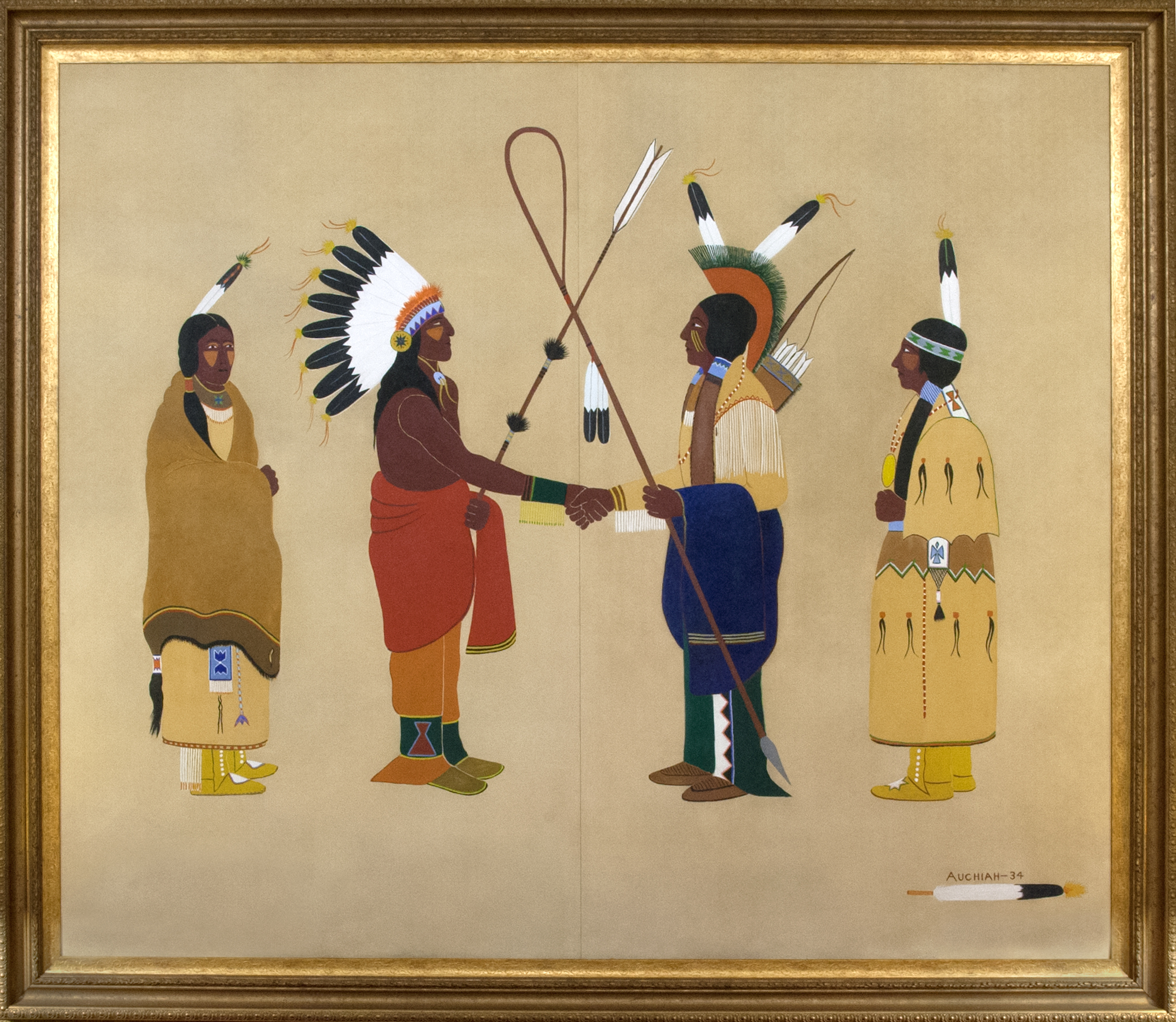 In 1934, Auchiah received a commission from the Federal Art Project to paint Indian Friendship, a oil on pressed board composed of two 4’ x 6’ panels placed side by side for an overall dimension of 6’ x 8’. It was originally completed for the Five Civilized Tribes Agency in Muskogee and later transferred to the Oklahoma Historical Society. It is now on permanent loan to the Oklahoma Judicial Center. The painting also appeared in the November 1990 issue of Oklahoma Today accompanying a story about the Kiowa artists who studied with Jacobson.
