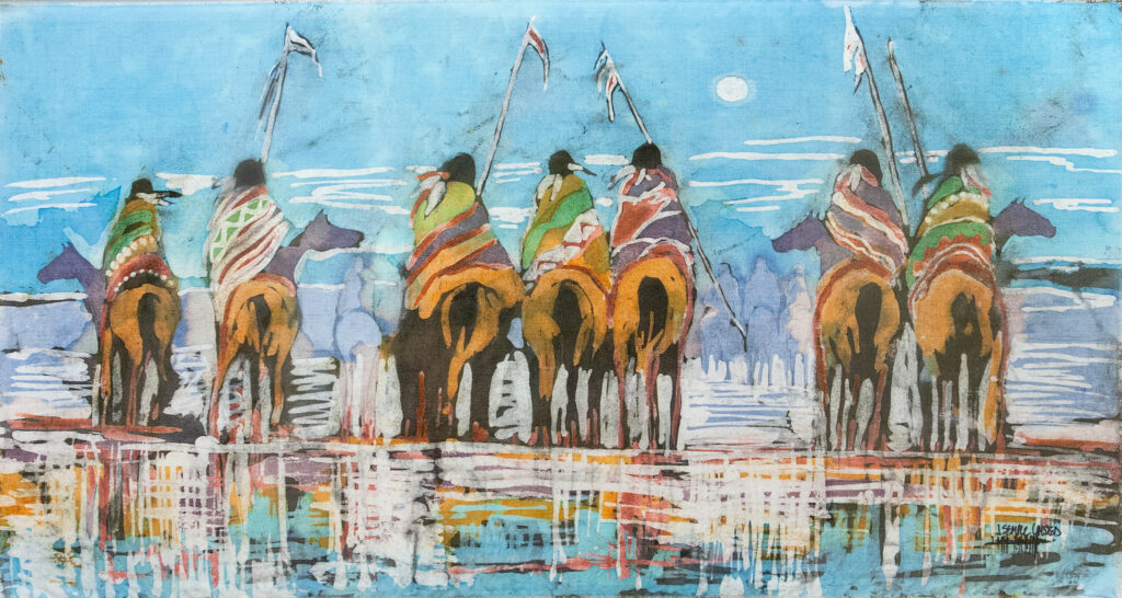 “It’s not exactly realistic, but it is believable,” Umsted said. She has used the Trail of Tears theme in several of her works, including large-scale oil paintings at the Choctaw Casino in Durant and the Choctaw Capitol Museum in Tuskahoma, Oklahoma. With Into the Dream Left Behind, Umsted wanted to provide a contemporary look at the sadness that comes from leaving a homeland. She has always gravitated to bright colors and stripes and wanted to include horses for her dad, a veterinarian, and her husband who loves horses. “The black of the horses and the turquoise both make a big impact,” she said.
