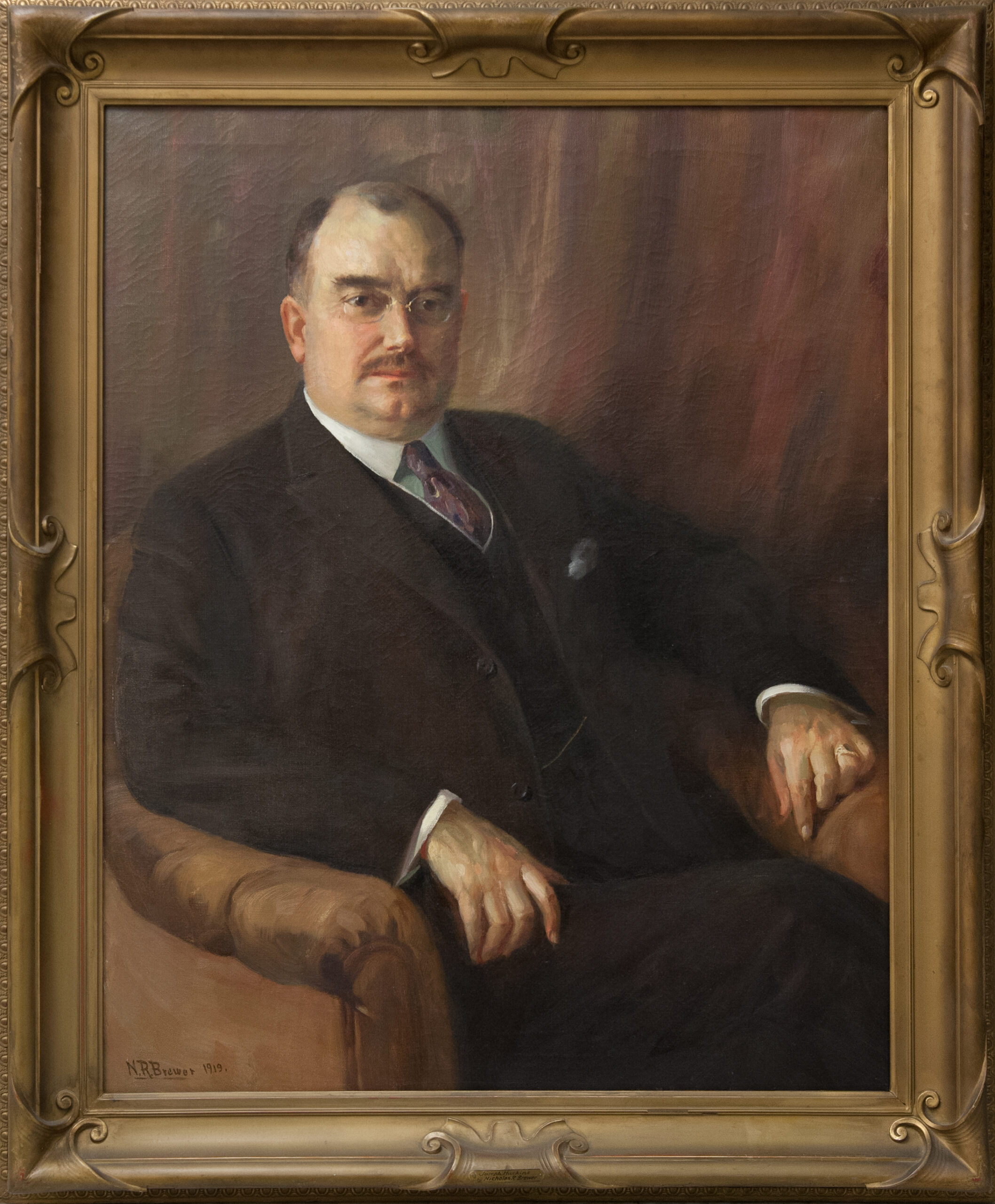 Nicholas Richard Brewer’s passion for art took him to New York City in 1879. There he studied with D.W. Tryon and Charles Noel Flagg. A talented student, by 1885 he was exhibiting at the National Academy of Design. He later painted portraits of many prominent Americans, including Theodore Roosevelt and United States Supreme Court Justice George Sutherland. Several of his works are in the National Portrait Gallery, the United States Senate collection and state capitols around the nation. The portrait of Huckins was donated to the Oklahoma Historical Society in 1953 by Mrs. James R. Shrayer of Springfield, Missouri and is now on permanent loan to the Oklahoma Judicial Center.