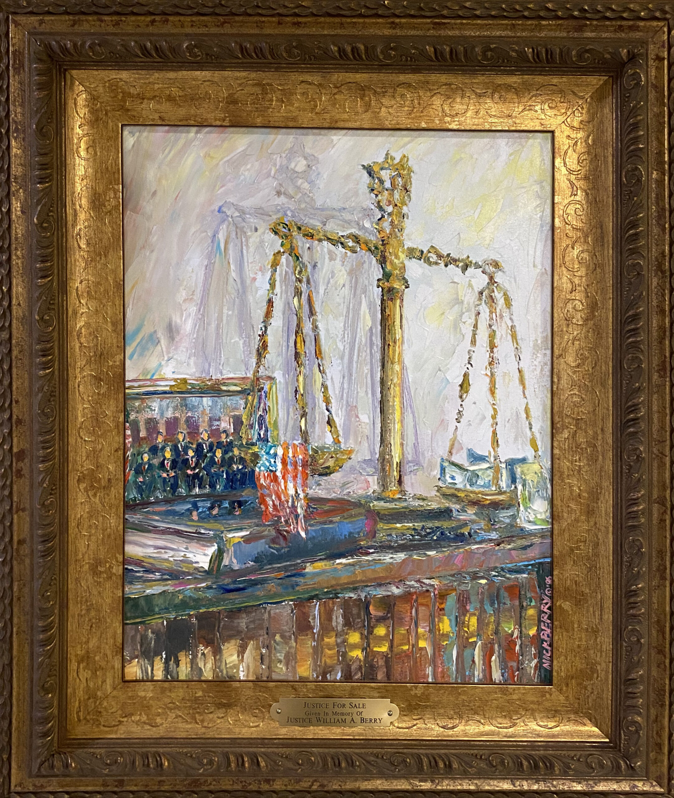 This painting by nationally recognized artist, Nick Berry, served as the cover of the book by his father, Justice William A. Berry, concerning the Oklahoma Supreme Court scandals. The scandals led to judicial reform and to the existence of the Judicial Nominating Commission. Justice Berry served on the Supreme Court was Chief Justice in 1971 and 1972.