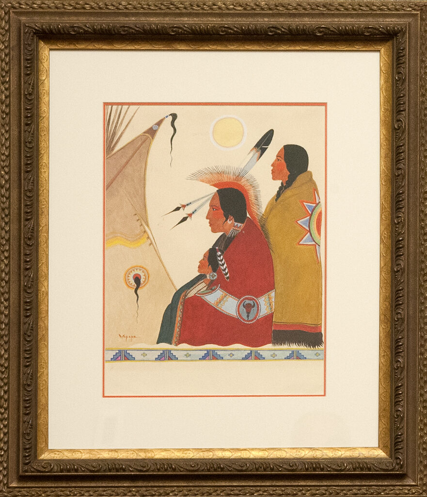 Throughout his life, Mopope’s main source of inspiration and subject matter came from Kiowa rituals and traditions. He completed many public art pieces during the 1930s, including murals at Southwestern Oklahoma State University, see page 145, the Anadarko Post Office, Northeastern Oklahoma State University at Tahlequah, Oklahoma, and the Department of the Interior Building in Washington, D.C.