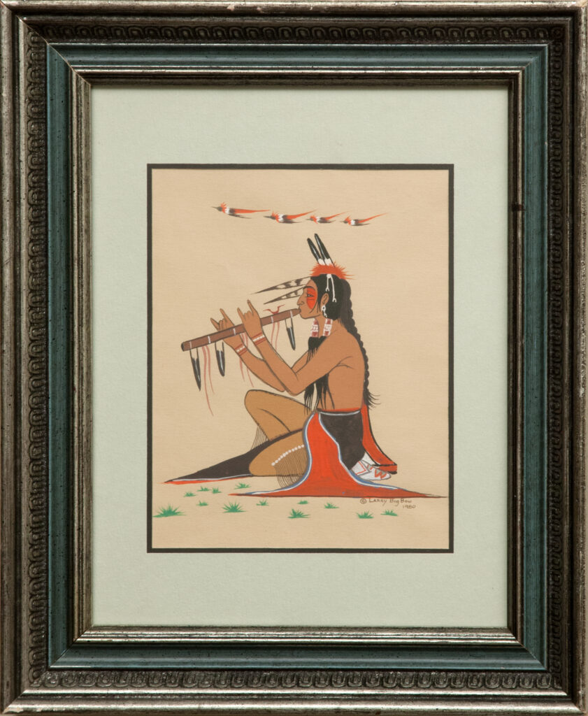 Artist Larry Big Bow was the son of Kiowa artist Woody Big Bow. The painting on paper is executed in the traditional Kiowa style and depicts a flute player. Flutes were used in ceremonies, for meditation and for courtship.