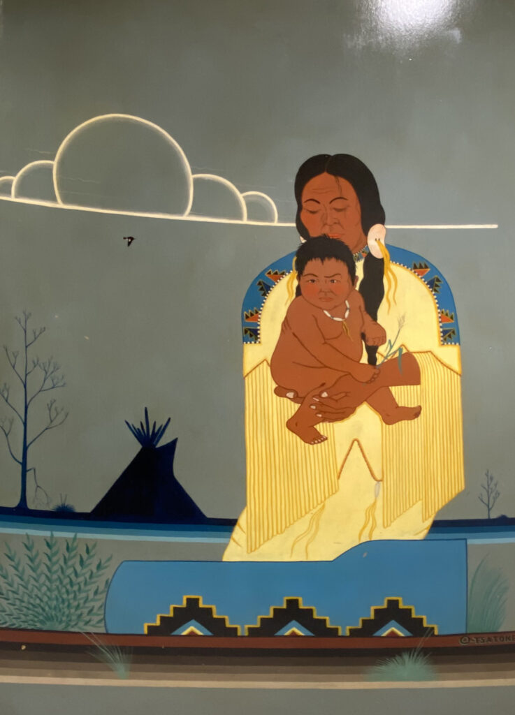 By Monroe TsaToke. This painting was a gift from the Colorado Historical Society. It was deaccessioned from their collection. It was painted as a mural on the private residence of a member of Bent family. A family recognized for their long association with Native Americans. The work is painted on plaster board.