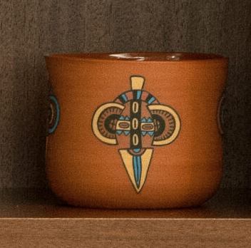 Thousands of years ago, a complex society inhabited what is now eastern Oklahoma. All knowledge of this culture comes from the impressive mounds they left behind, with the most recognized site being the Spiro Mounds in Le Flore County. Most Spiro excavation occurred during the 1930s and yielded thousands of artifacts, dubbed the “King Tut of the Arkansas Valley.” Haphazard excavations destroyed a third of the mound, prompting the University of Oklahoma to take over excavation work. Today, the Sam Noble Oklahoma Museum of Natural History at the University of Oklahoma holds one of the largest collections of Mound Builder pottery in the United States, and the Spiro excavation area is now a protected Oklahoma Historical Society site. Artist Victoria McKinney first encountered motifs from the Mound Builder culture during an anthropology course. An enrolled member of the Echota Cherokee Tribe of Alabama, McKinney’s work has taken top honors in numerous shows. McKinney’s piece in the Oklahoma Judicial Center collection was donated by Justice Yvonne Kauger.