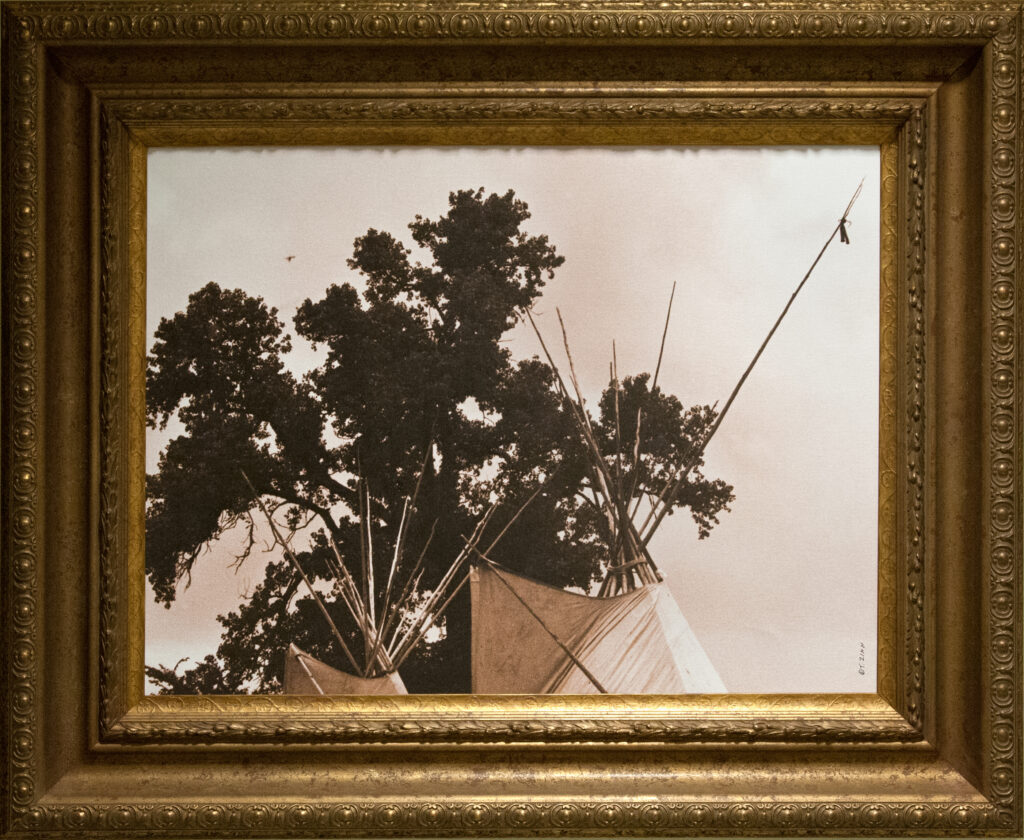 Both Moccasin photographs are sepia tone prints originally displayed as part of the “Last Pow Wow” show at the Kirkpatrick Center in 1982. The show was dedicated to John, Alice and Yvonne Kauger and all Native Americans seeking to preserve their heritage. “Last Pow Wow” refers to the Cheyenne-Arapaho Labor Day Pow Wow held each year in Colony since World War II. Pow wows offer a unique fusion of ceremonial and social celebrations, providing the opportunity to wear traditional clothing like moccasins. Tiny seed beads sewn by hand create intricate designs, elevating the moccasins from footwear to treasured objects. The same pair are often worn year after year for ceremonial dances.