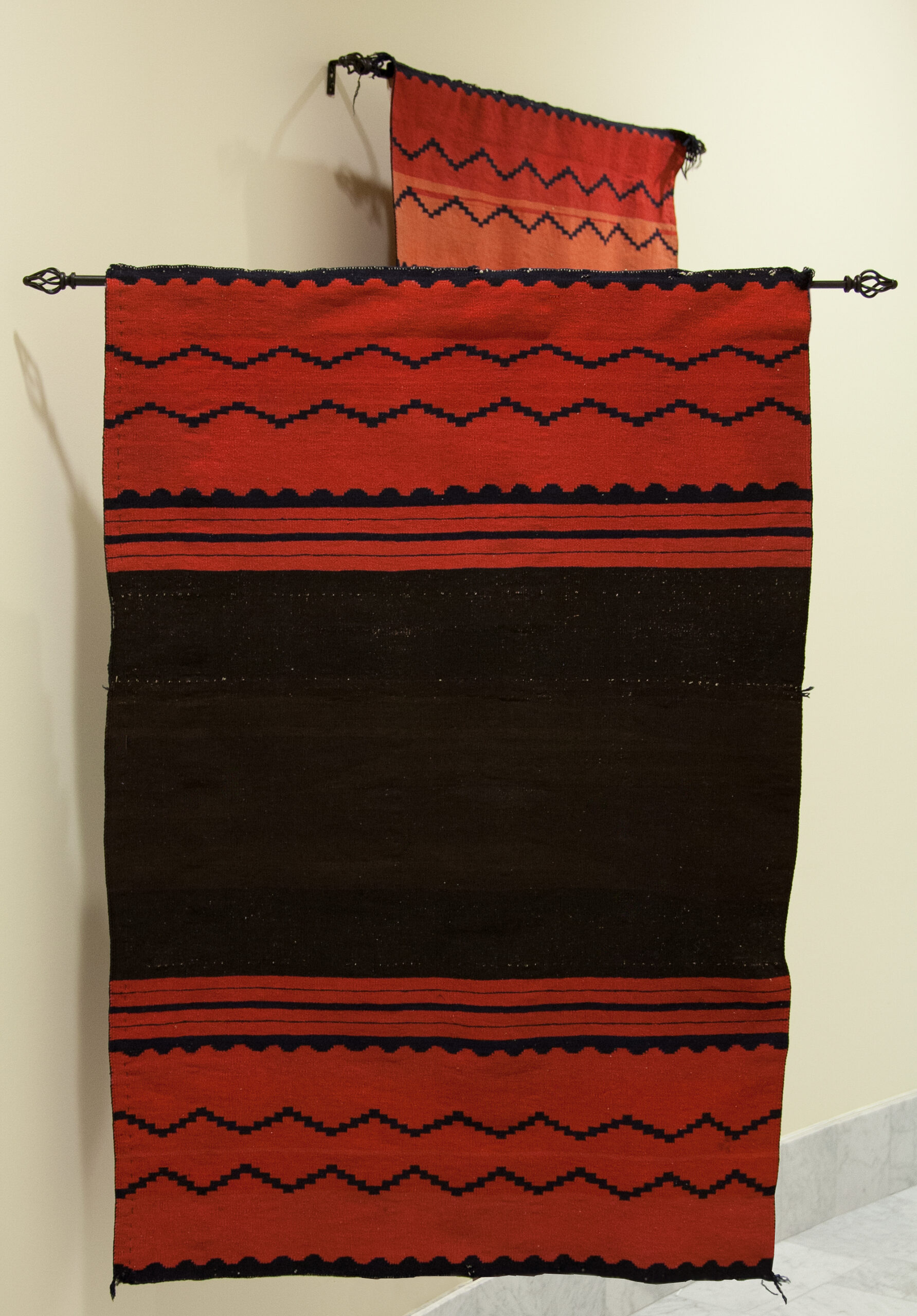 Woven on a loom, these dress panels are more than a century old and mark important turning points in the history of Navajo culture. The two pieces would have been tied together at the “buttonholes” along the edges, with additional ties along the top forming the neck opening. Formerly part of the Historical Society collection, these panels are now on permanent loan to the Oklahoma Judicial Center.