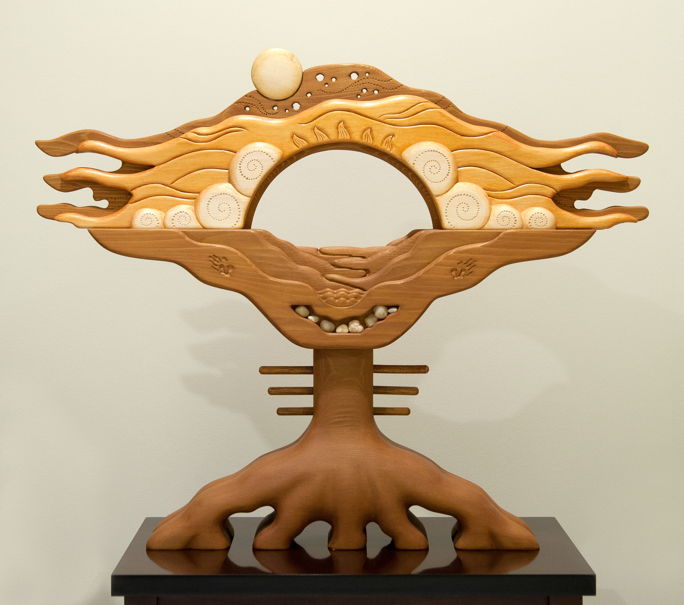 “The people who call Oklahoma home have the same characteristics as wood – aliveness, tenacity and strength, so wood seemed the perfect medium for the sculpture,” Scott said. She chose cedar for its dark, earthy, sturdy grain to represent the roots and land. Basswood was used for its light color, fine grain and airy texture to create the clouds, sky and moon. The design employs multiple layers of cedar and basswood to reflect the many layers of our state’s people, land and history. “Roots speak to Oklahoman’s deep connection to the land and our essential need for and commitment to, justice for our people.”