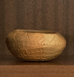 Cherokee artist lives on a ranch near Tahlequah, Oklahoma where she has been making traditional pottery since 2005. Rutherford digs her own clay, uses the traditional coil method to build the pot, and then fires it in a wood fire under a full moon. Her pottery has garnered recognition both in Oklahoma and nationally. Rutherford is also a skilled artisan of traditional Cherokee beadwork. Her piece in the Oklahoma Judicial Center collection was donated by Justice Yvonne Kauger.