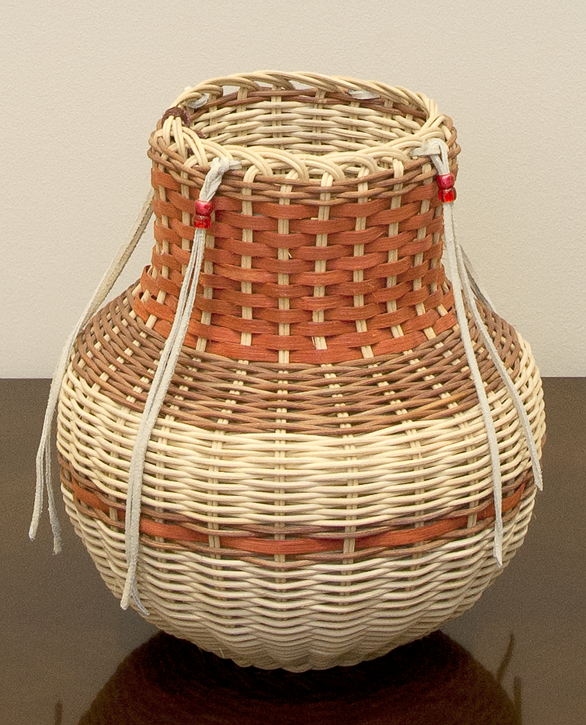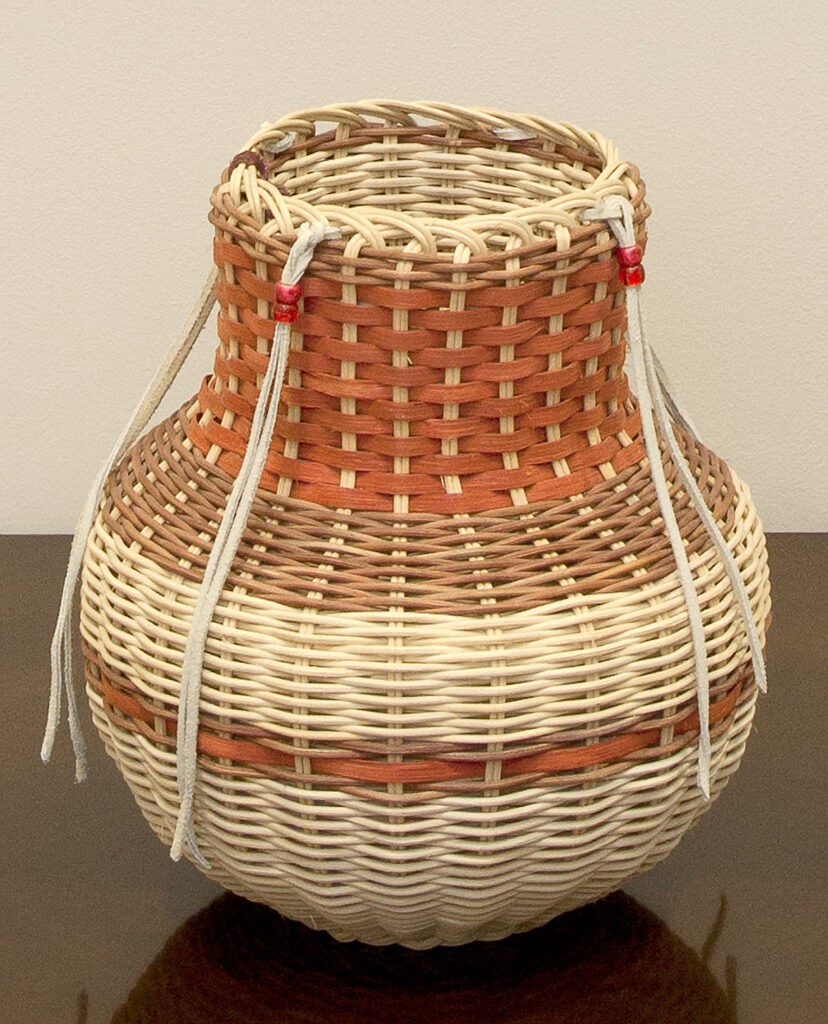 Stone’s work has been displayed throughout Oklahoma and she has participated in many shows, including Tsa La Gi at the Cherokee Nation Museum in Tahlequah and the Five Civilized Tribes Museum in Muskogee. She has also exhibited at the Red Earth Festival in Oklahoma City, the Haskell Indian Nations Art Show in Lawrence, Kansas, and the Winter Expo at the Kirkpatrick Center in Oklahoma City. Stone continues to share her love of basket weaving with students in community art programs across the state. This piece was donated to the Oklahoma Judicial Center by Justice Yvonne Kauger.