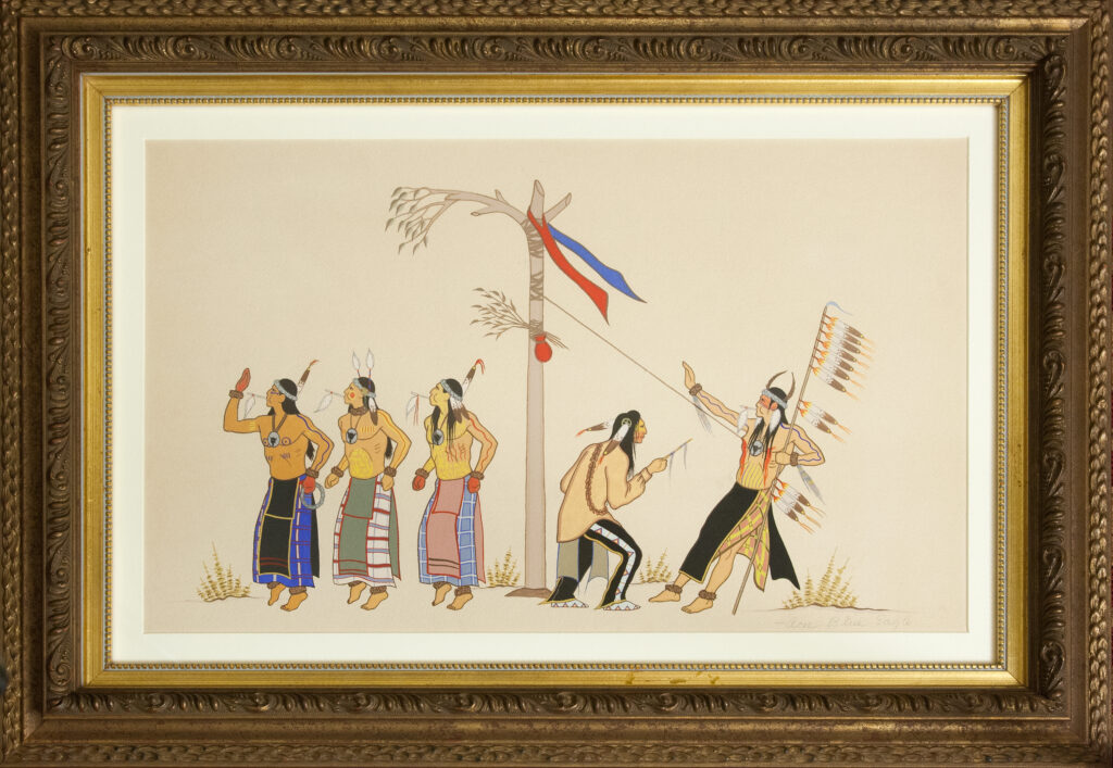 Acee Blue Eagle’s Creek name, Che-bon-Ah-be-la, translates into English as “Laughing Boy” but the tragedies of Blue Eagle’s early years were no laughing matter. Originally named Alexander C. McIntosh, his twin brother died shortly after birth. Acee’s mother, Martha Odom McIntosh, died when he was a toddler. His father, William Solomon McIntosh, was grandson of Chillicothe McIntosh, a chief of the Creek Nation and a descendent of Captain John McIntosh who left the Scottish Highlands in 1736 to settle in Georgia. McIntosh County, in eastern Oklahoma, is named for the family. Blue Eagle’s father died when he was eight and he was sent to live with his grandparents. But, they too, died within a few years. He attended the Nuyaka Indian boarding School near Bristow and Haskell Institute in Lawrence, Kansas before transferring to the Chilocco Indian School, where he graduated in 1926. It was at Chilocco that he began to paint in earnest. He also learned to play the flute and took part in traditional dances, and made his own dance regalia.