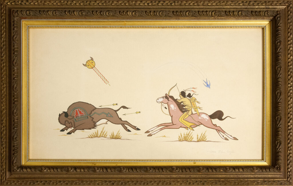 In 1934, he began painting murals as a part of the Works Progress Administration’s Public Works of Art Project. Interviews he gave at the time explain Blue Eagle’s philosophy about his art. “I am interested in recording the story of my ancestors which will soon be forgotten unless immediate steps are taken.”