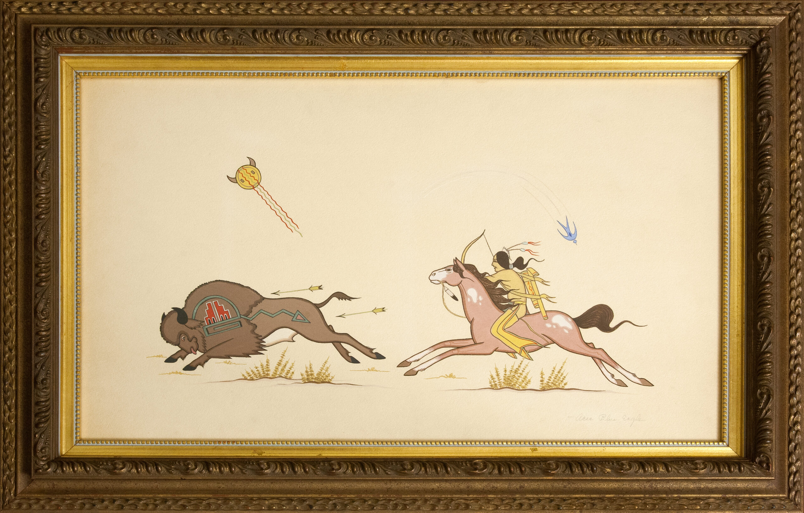 In May 1932, Blue Eagle completed his bachelor of fine arts degree at the University of Oklahoma. After graduation, he participated in numerous art exhibitions around the country: at the Los Angeles Olympic Games, at the Chicago Century of Progress and at the National Exhibition of Art at Rockefeller Center & Museum of Modern Art in New York City.