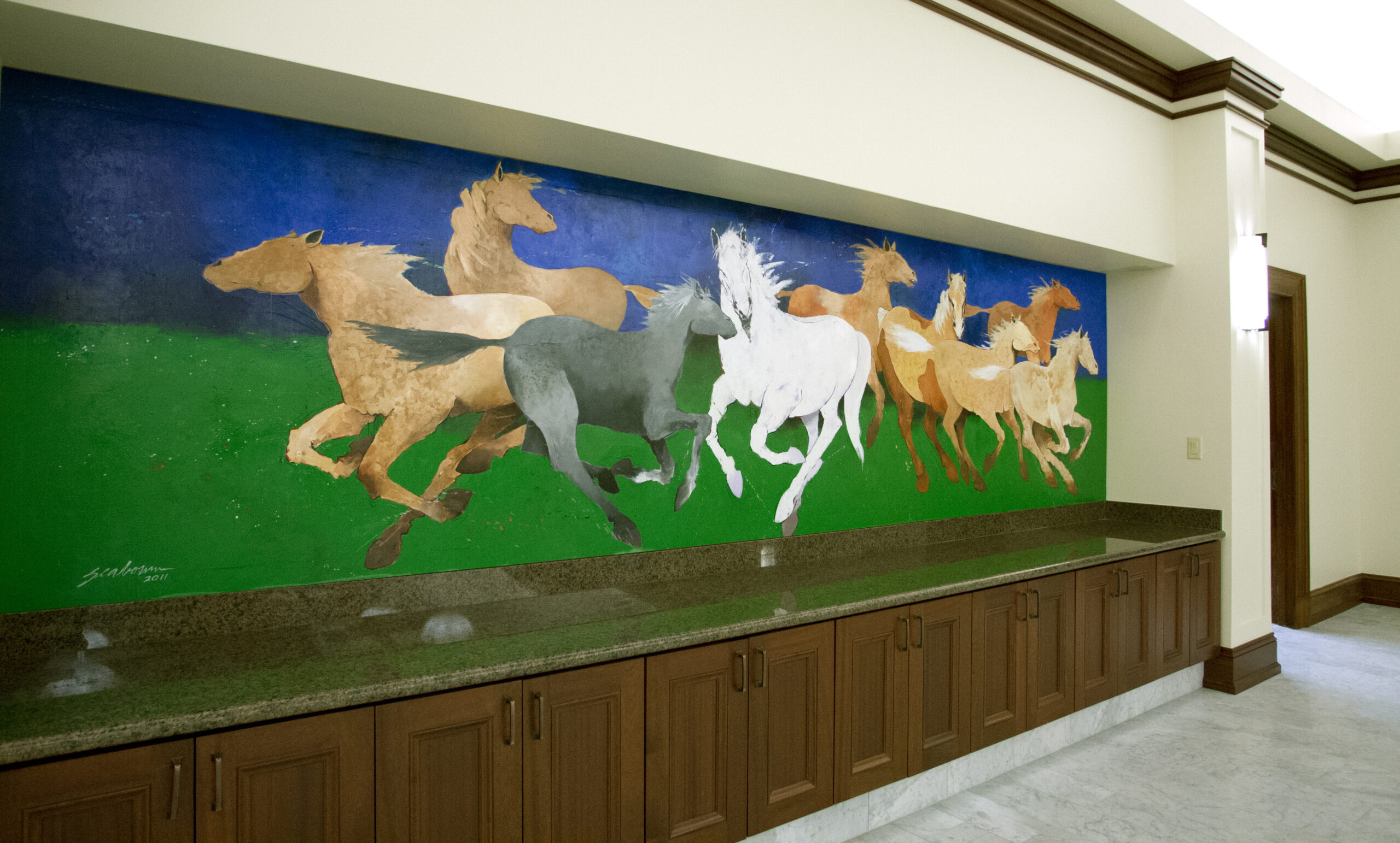 The Choctaw Horses (Chahta Issi) mural was commissioned for the Oklahoma Judicial Center Great Room in late 2010. The nine horses represent the nine Justices of the Supreme Court of Oklahoma. “I saw the space and had the inspiration of nine justices, nine horses,” said Bert Seabourn. The mural measures more than fifteen feet long and is fifty-one inches high, acrylic on canvas.