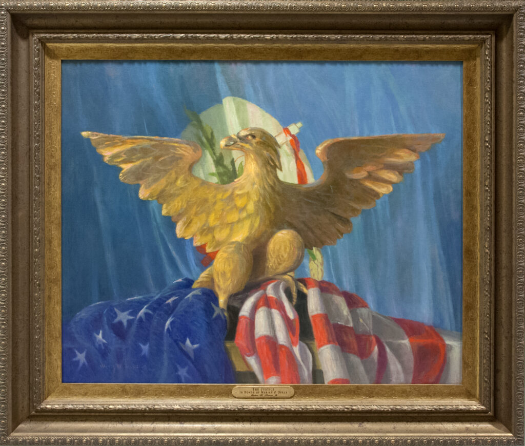 The Justice in honor of Marian P. Opala depicts an American eagle surrounded by the Stars and Stripes with the Oklahoma flag in the background. Artist James Bruce thought America’s national bird would be a fitting tribute to his very good friend, Justice Marian Opala, who overcame great adversity in his early life. Bruce donated the painting to the Oklahoma Judicial Center collection.