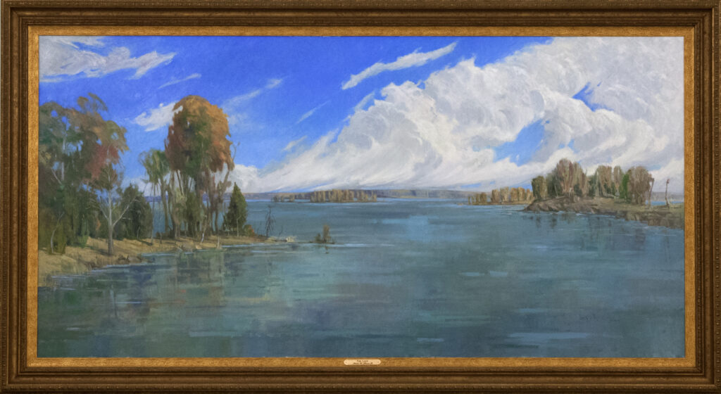 The Lake was commissioned especially for the third floor great room of the Oklahoma Judicial Center and completed in 2011. The painting measures 48 x 96 inches. Rather than a specific lake, the scene is intended to conjure that Oklahoma weekend pastime of “going to the lake.” The state has more than 55,000 miles of shoreline along lakes and ponds, more man-made shoreline than any other state in the Union.
