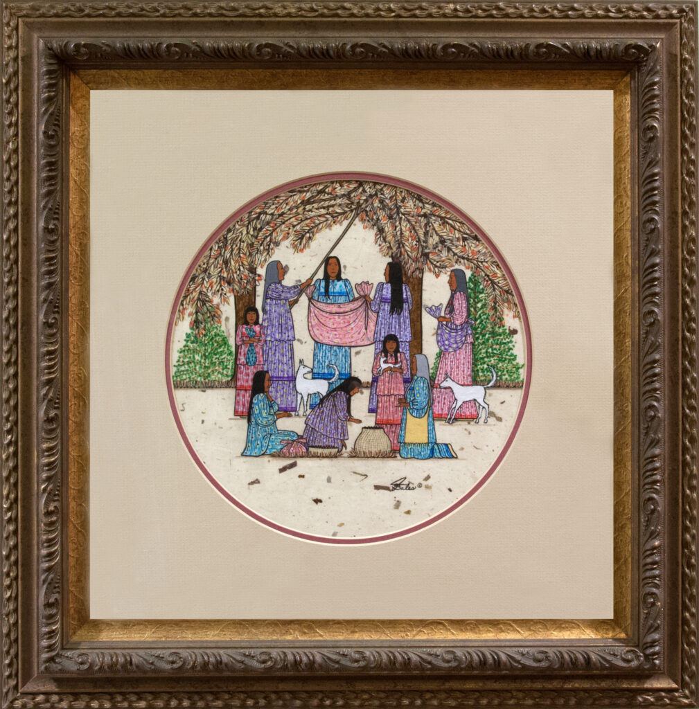 Her work has been exhibited at the National Indian Art Exhibit, the Heard Museum in Phoenix, and the Denver Museum of Natural History. Her work was also featured on a French wine label in the late 1980s. In 1984, she was named Artist of the Year by the Indian Arts and Crafts Association. The Nut Harvest is acrylic on handmade paper and is on permanent loan from the Oklahoma History Center.