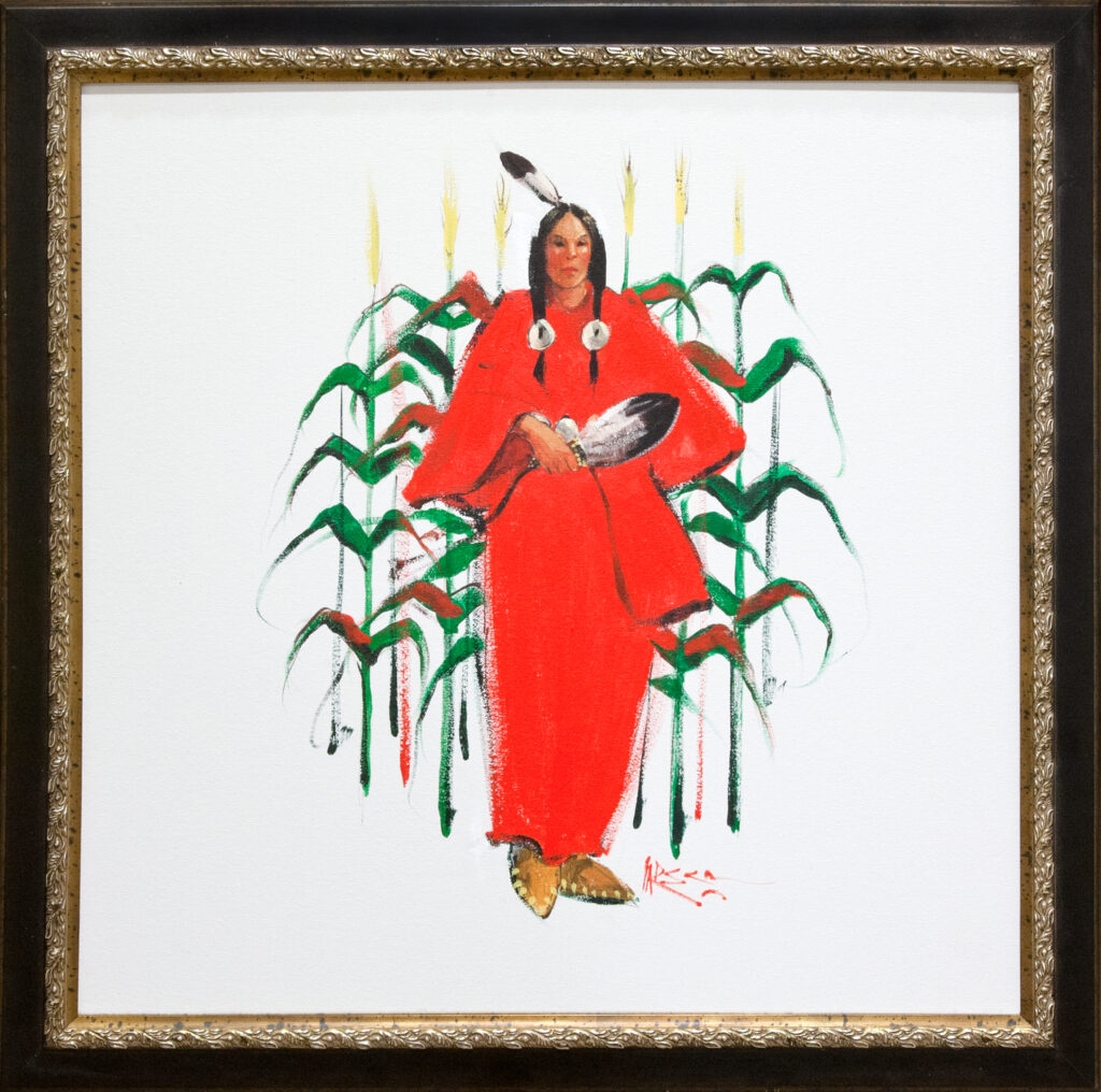 Peacekeepers served as the theme for 2008 and Larsen was asked to paint noted Kiowa dancer Dixon Palmer in his Kiowa Black Leggings regalia as the featured subject of the poster. The Kiowa Black Leggings have served as Color Guard for the Sovereignty Symposium every year since its inception. Palmer would also be named as Honored One at the Sovereignty Symposium the same year. At the time, Palmer was in poor health and unable to sit for a portrait. Fortunately, Larsen had previously completed a series of large murals for the Arts Institute at Quartz Mountain that included Palmer. Larsen relied on photos, sketches and memories of creating that previous work to complete the Peacekeeper image of Palmer. “We got to be very good friends,” Larsen said of Palmer. “He laughed a lot.”