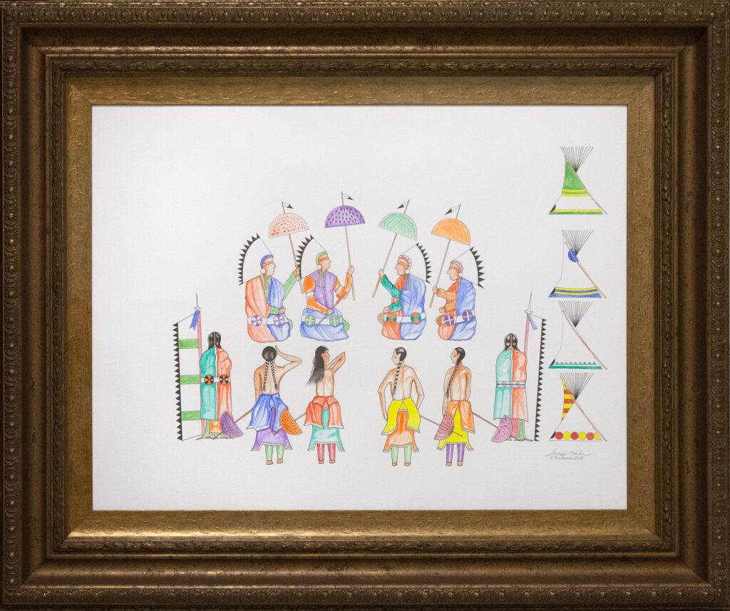 This piece is an example of Cheyenne ledger art, reminiscent of the 19th Century works produced by Plains Indian artists who had few sources of paper beyond ledger books. Artist Gordon Yellowman incorporates modern hues, giving his work a more contemporary feel of artistic expression.