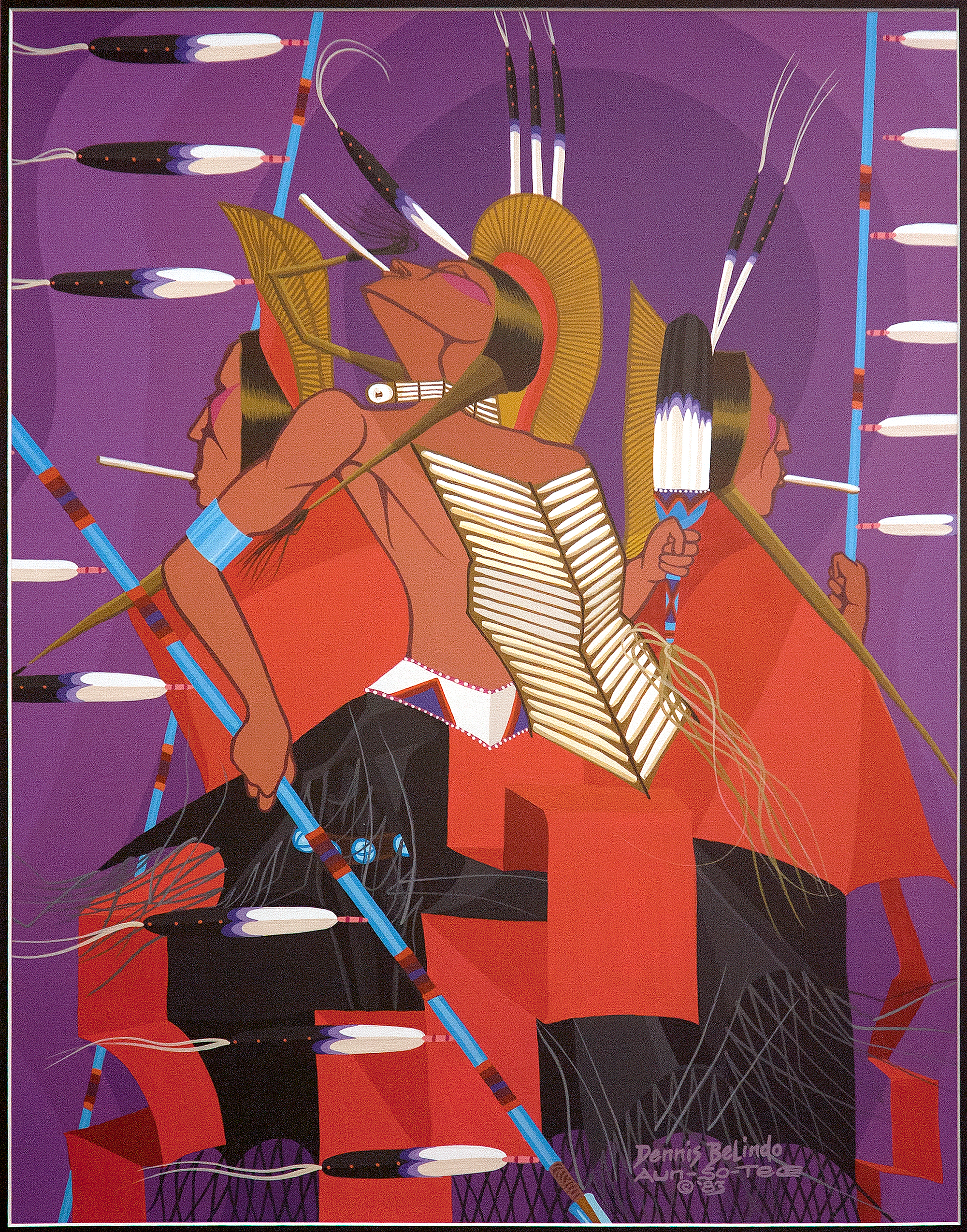 Of his painting, Belindo said, “My artistic contribution to today’s society is an extension of my ancestor’s gift to me. I consider myself a neo-traditionalist. I employ the traditional Indian painting technique of using form, line and color to record in pictorial narrative the history and material culture of our people. I add to the traditional approach a high degree of self-expression, which is a reflection of me as an individual and encompasses my influences, my training and my experiences. I am fascinated by form, movement, color and tension within the picture plane, however tension which is quieted by balance, harmony, feeling and emotion.”