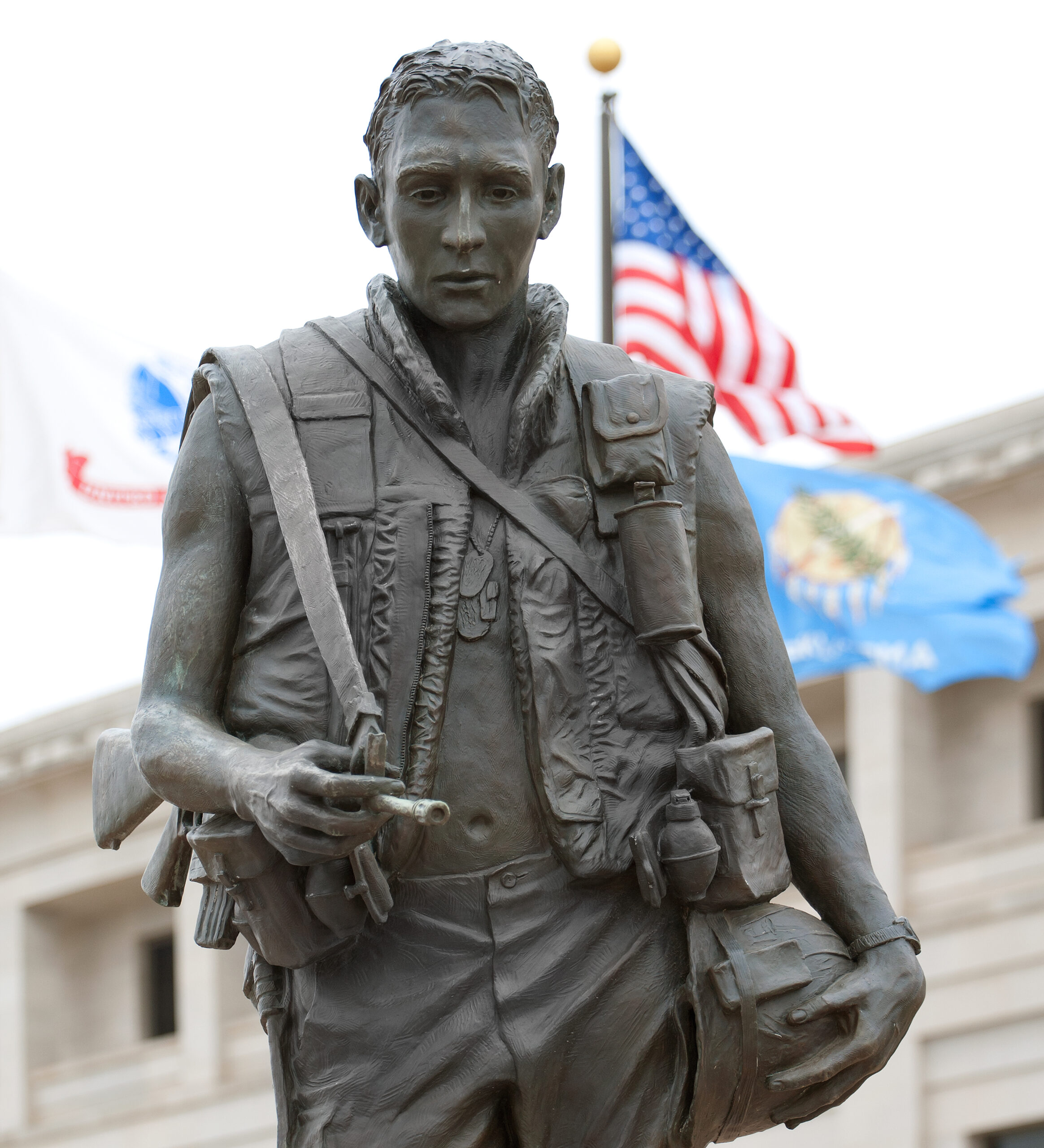 Vietnam Veteran, an eight-foot bronze figure wearing a 1960’s combat uniform is a tribute to the 54,000 Oklahomans who served in the Vietnam War. His M-16 rifle is relaxed, but ready, as if he has just returned from a patrol. Artists Jay O’Meilia and Bill Sowell used an 18-year-old of Osage descent as a model for the monument.