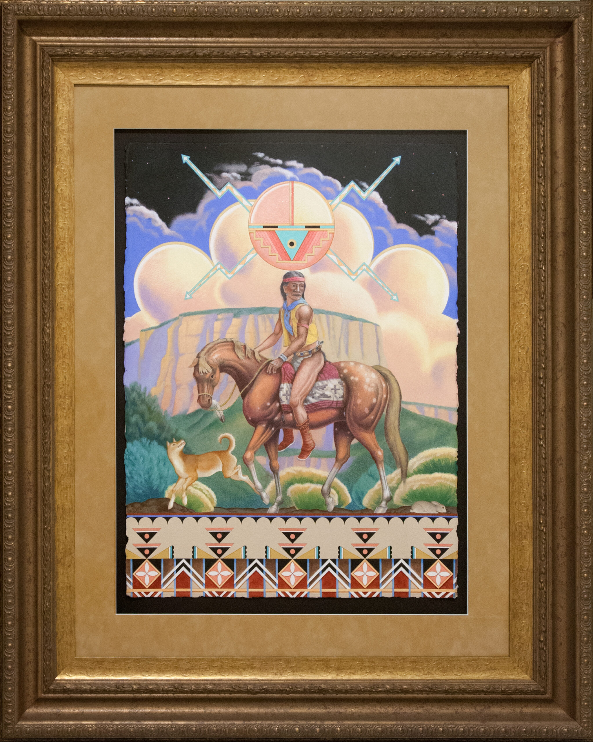 Fernando Padilla began drawing before kindergarten, but didn’t pursue his art seriously until a back injury kept him from working as a truck driver. That was in 1987, since then he has exhibited his work extensively throughout Oklahoma and the Southwest. One of his largest commissions came in 1993, when he was selected to do part of a large mural, Spirit of the People, for the Denver airport. The piece depicts the history of Colorado from ancient times to the present through the Native perspective. Padilla’s section focuses on an Anasazi cliff dwelling.