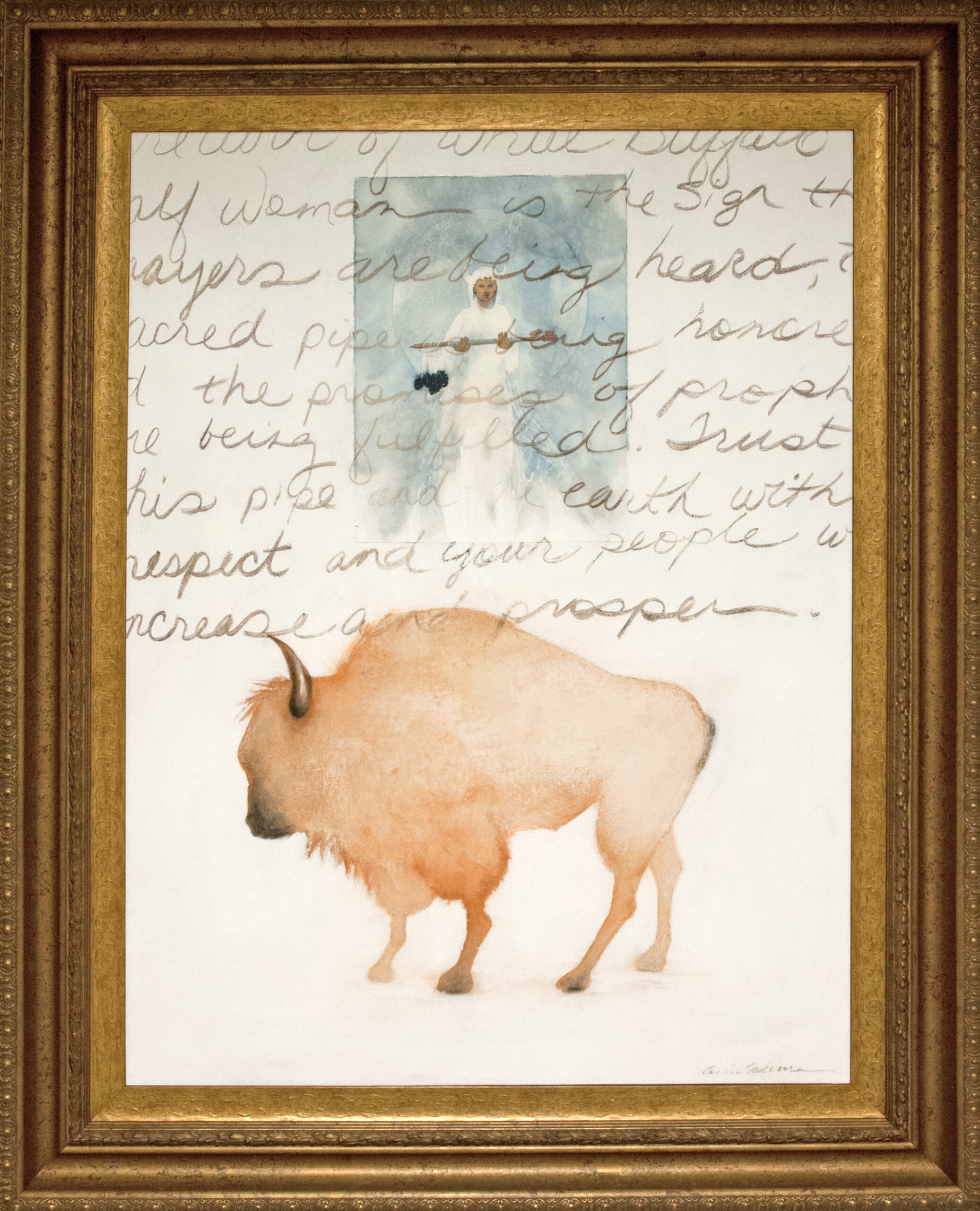 White Buffalo Calf Woman is a mixed media work that includes watercolor, drawing and collage. The multi-step process began with drawing the figure to collage onto the top center of the piece. Seabourn then used charcoal to write the words of the legend on the canvas. She selected this technique because the story would not exist without the oral tradition of words handed down from person to person. The faint letters evoke the feeling of an ancient legend. “When things are passed down they may become sketchy and we may not get the whole story.”