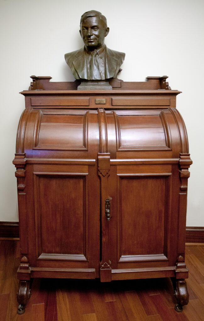 Sculptor Herbert Adams was a leading American sculptor during the first half of the twentieth century. His biographical information appears on page 16. The Will Rogers’ bust, along with a bust of Wiley Post, was presented to the Historical Society in a special ceremony on February 13, 1938. The proceedings began with a fly-over by the Southwestern Aviators Association who dropped floral offerings on the front steps of the Historical building. The Indian Glee Club from Mountain View, Oklahoma then sang “America.” The main address was delivered by Judge Thomas Doyle of the Court of Criminal Appeals and President Emeritus of the Historical Society. Doyle’s biographical information appears on page 18, and an excerpt of his speech appears on page 10. The bust of Will Rogers is displayed in the Chief Justice’s Chambers, atop a nineteenth century Wooten Desk. Indianapolis entrepreneur William Wooton patented his desk design on October 6, 1874, calling it “Wooton’s Patent Cabinet Office Secretary.” The multiple drawers and slots were in response to the recent technological advancement of the typewriter. It vastly increased the amount of paperwork produced, creating demand for desks with spaces to hold all that paper. Ads at the time described it as “The most complete desk for filing documents ever made. Well adapted to the use of county officers.” The desk would have originally had a drop-down leaf used as a writing surface. Slots for metal slides to secure the leaf are still visible on either side of the main unit.