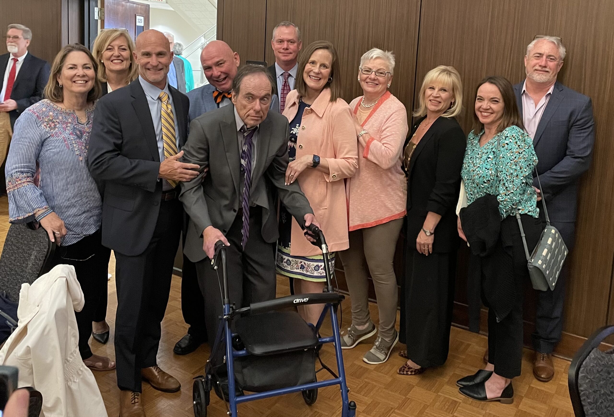 Oklahoma Journalism Hall of Fame Justice Kuehn, along with Judge Bill Musseman, Judge Jane Wiseman, and Judge Rebecca Nightingale celebrate Tulsa World Courthouse reporter, Bill Braun at his induction into the Oklahoma Journalism Hall of Fame.