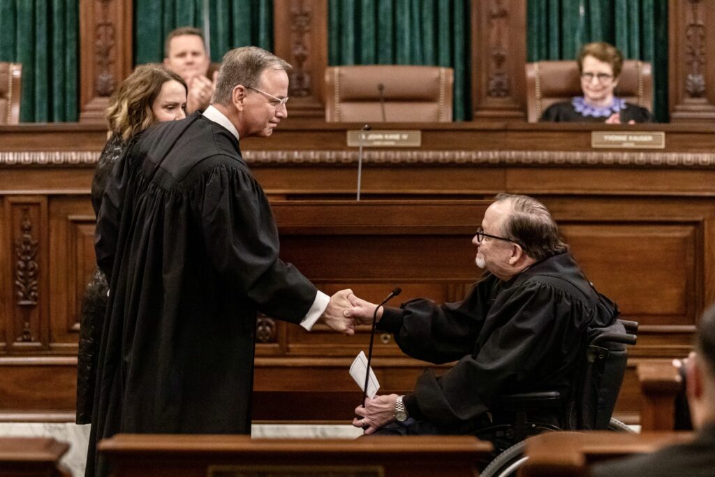 Chief Justice John Kane, IV was sworn in as Chief by Justice Darby. Chief Justice Kane is the great-grandson of a member of Oklahoma’s first Supreme Court: Chief Justice Matthew John Kane I, whose portrait hangs in the court. The Chief’s family was present for the ceremony.