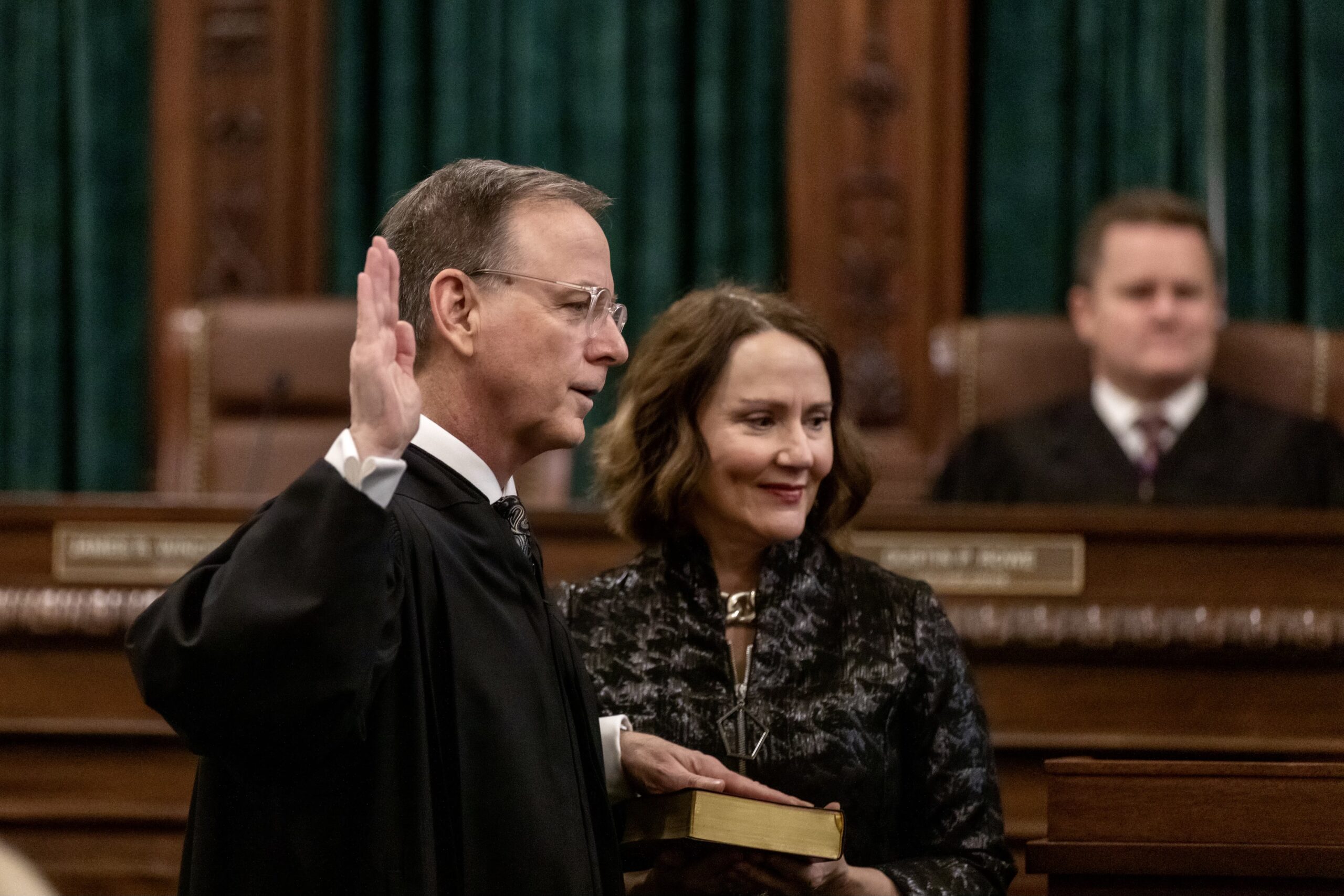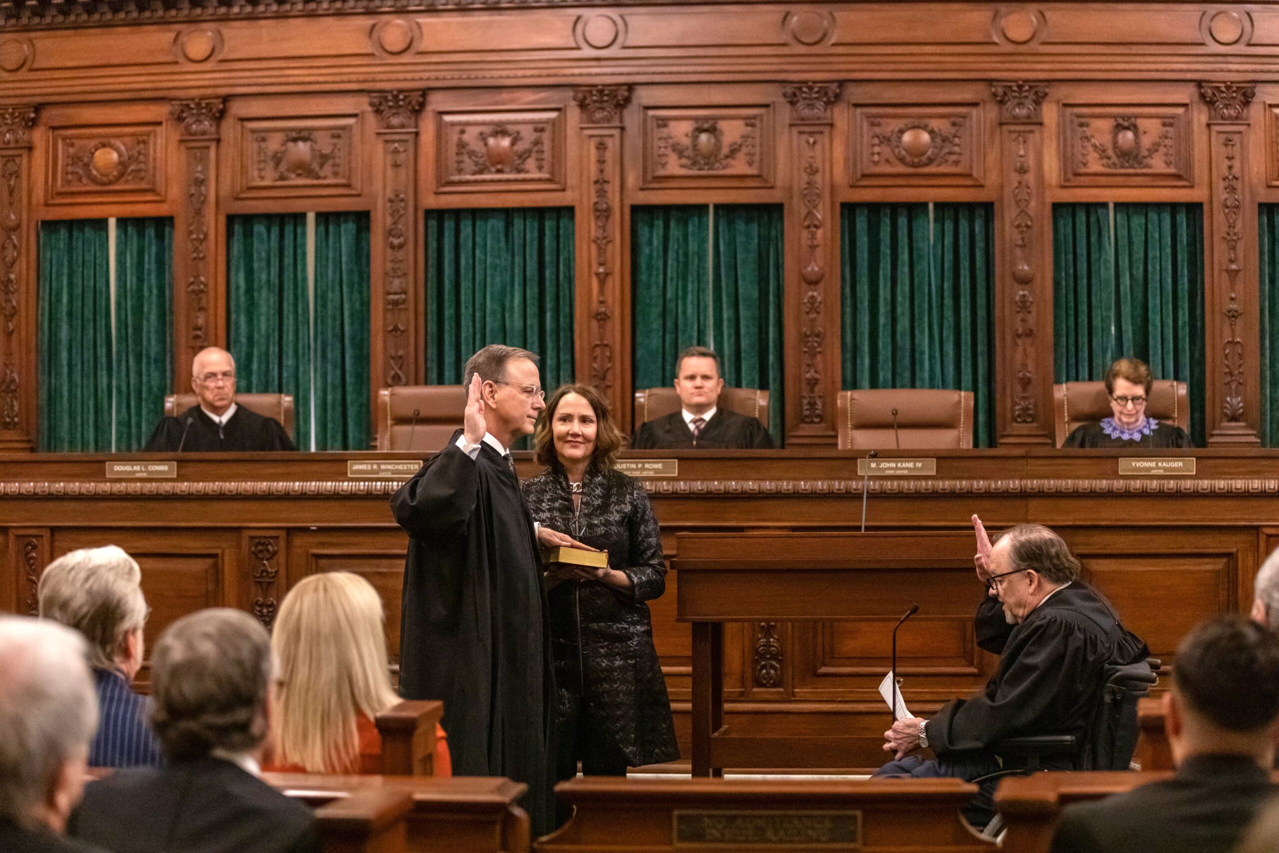 Chief Justice John Kane, IV was sworn in as Chief by Justice Darby. Chief Justice Kane is the great-grandson of a member of Oklahoma’s first Supreme Court: Chief Justice Matthew John Kane I, whose portrait hangs in the court. The Chief’s family was present for the ceremony.